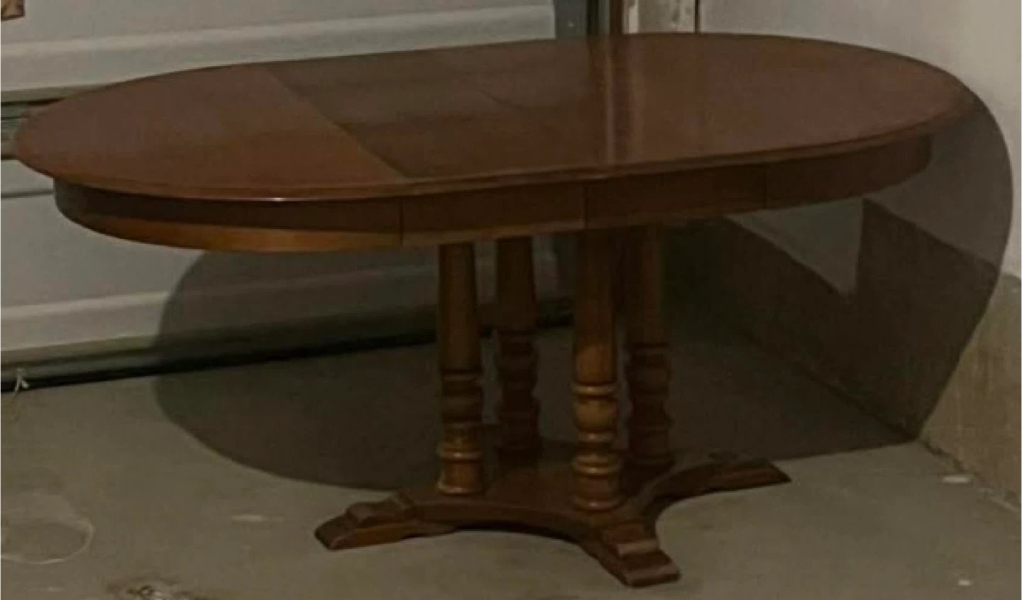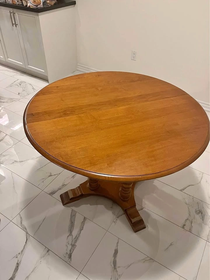Solid wood. Comes with two leaves. Top of the table comes off. Approx. height: 32". Approx. length of table top (without leaves attached): 42". Approx. length of leaves: 12" each. Total length of table top: Approx. 66". Pick up at Brampton.