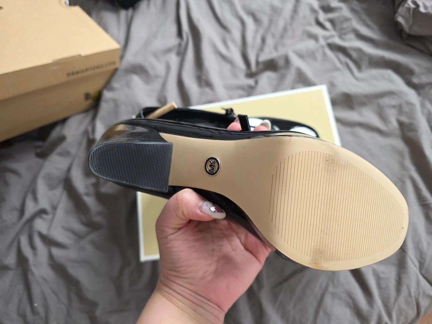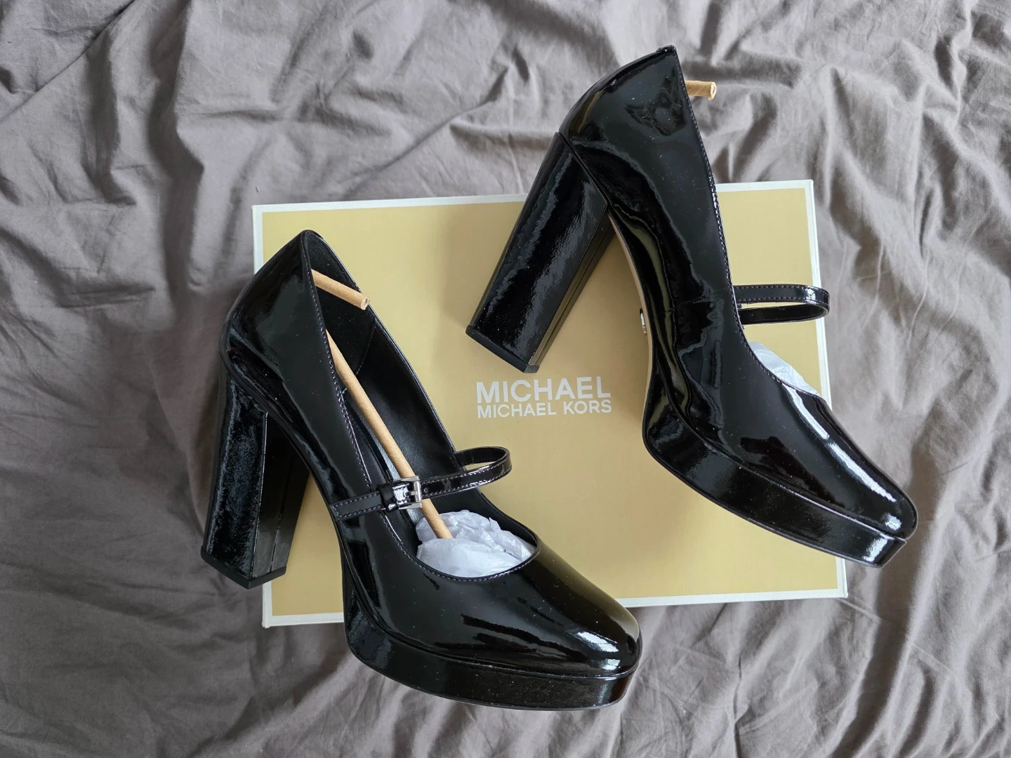 Shiny black patent leather Mary Jane style heels. They feature a platform sole and a buckle strap closure. Comes with original Michael Kors box. Used only to walk around the house but it's not really for me.