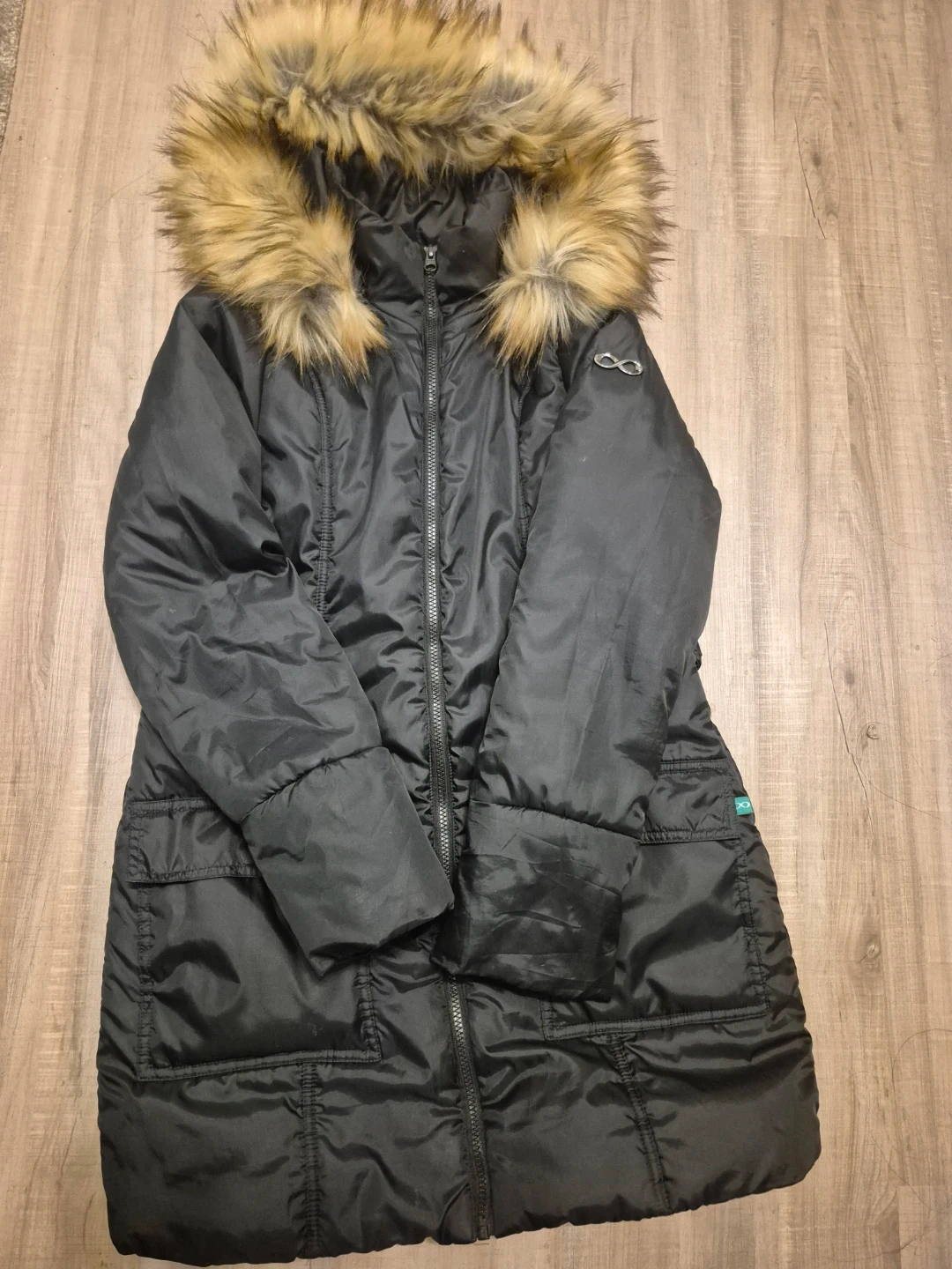 This black puffer coat is designed for warmth with a cozy faux fur-lined hood. It features a full zip front and multiple pockets for convenience. It's a stylish and practical choice for colder weather.