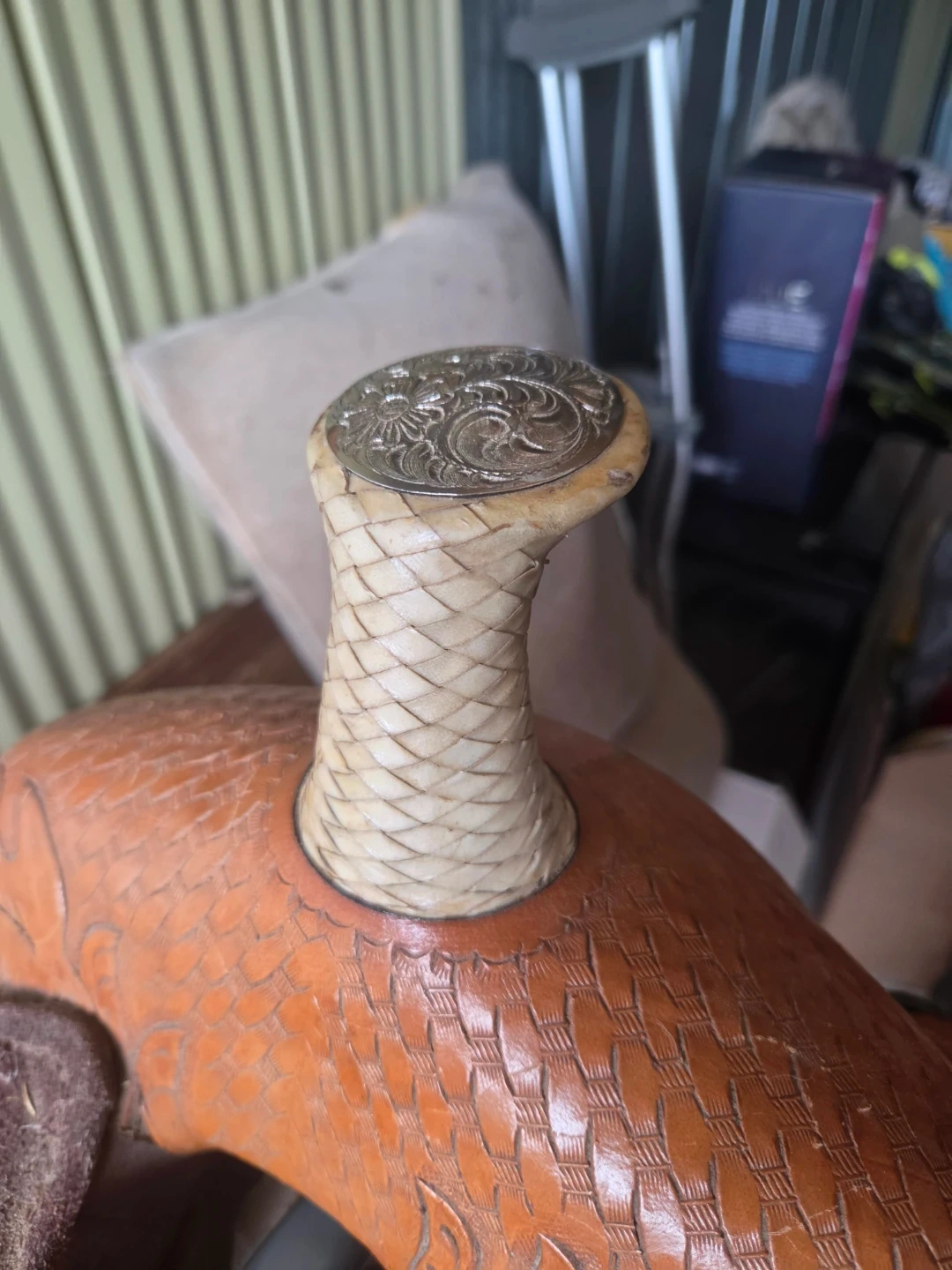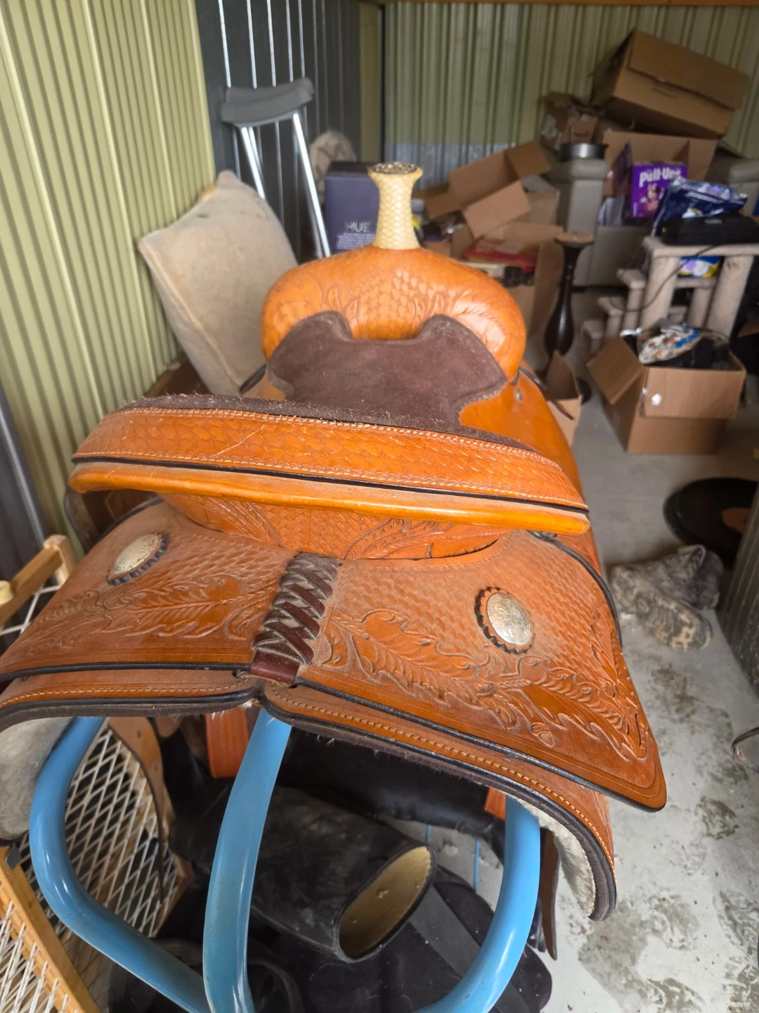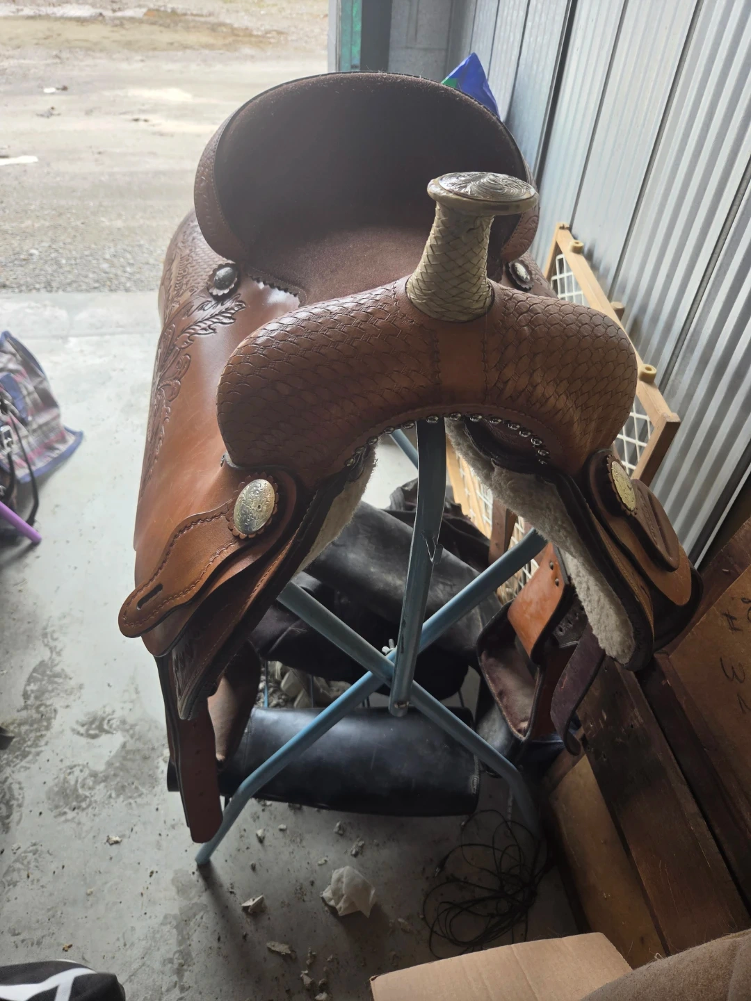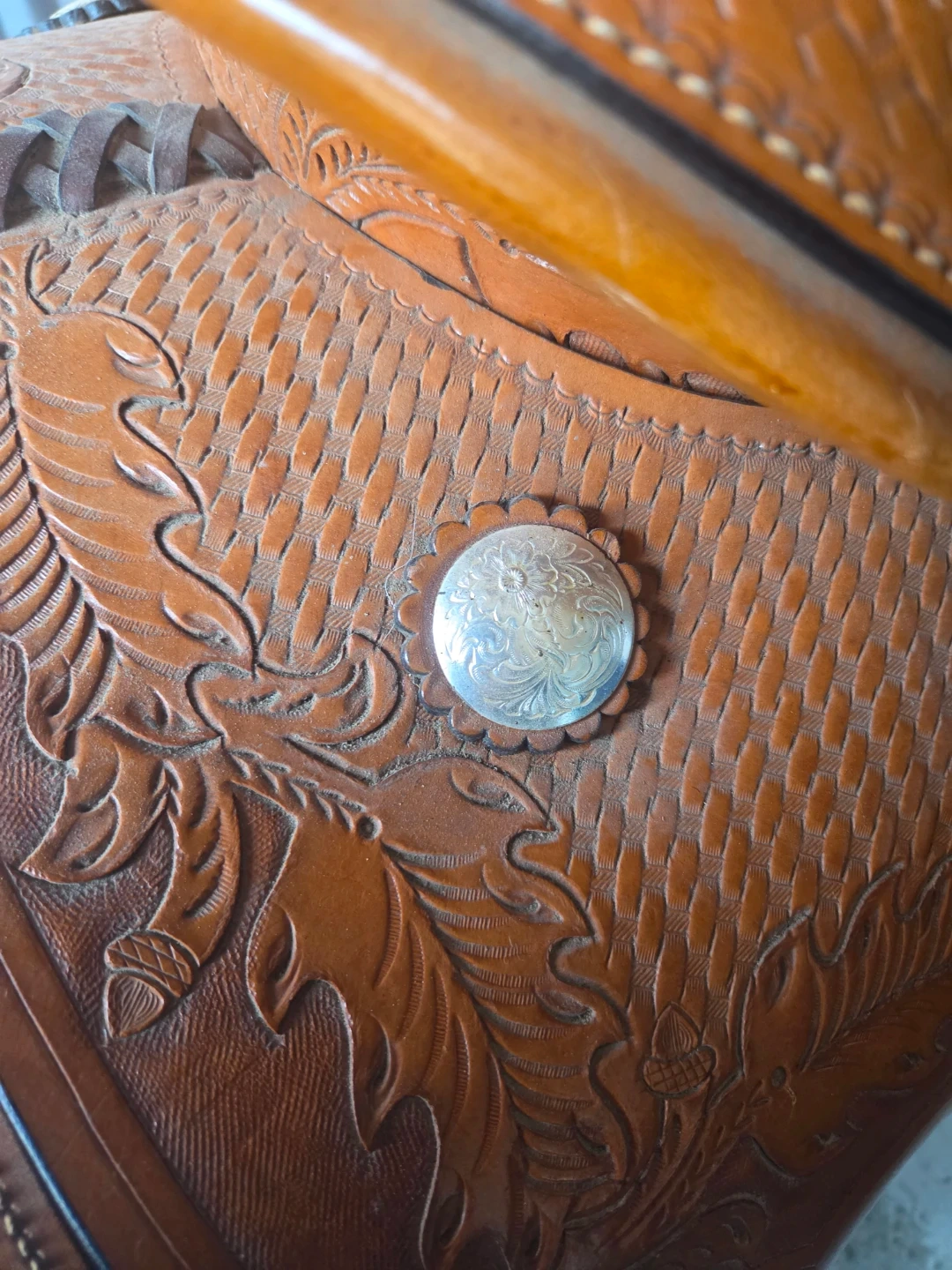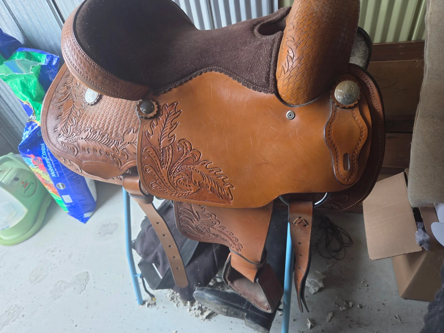 Beautiful 15β western saddle in great condition. Lightly used (approx. 10β15 rides in the show ring a few years ago). Real leather with detailed floral and basketweave tooling, suede seat for extra grip, and a solid overall build.