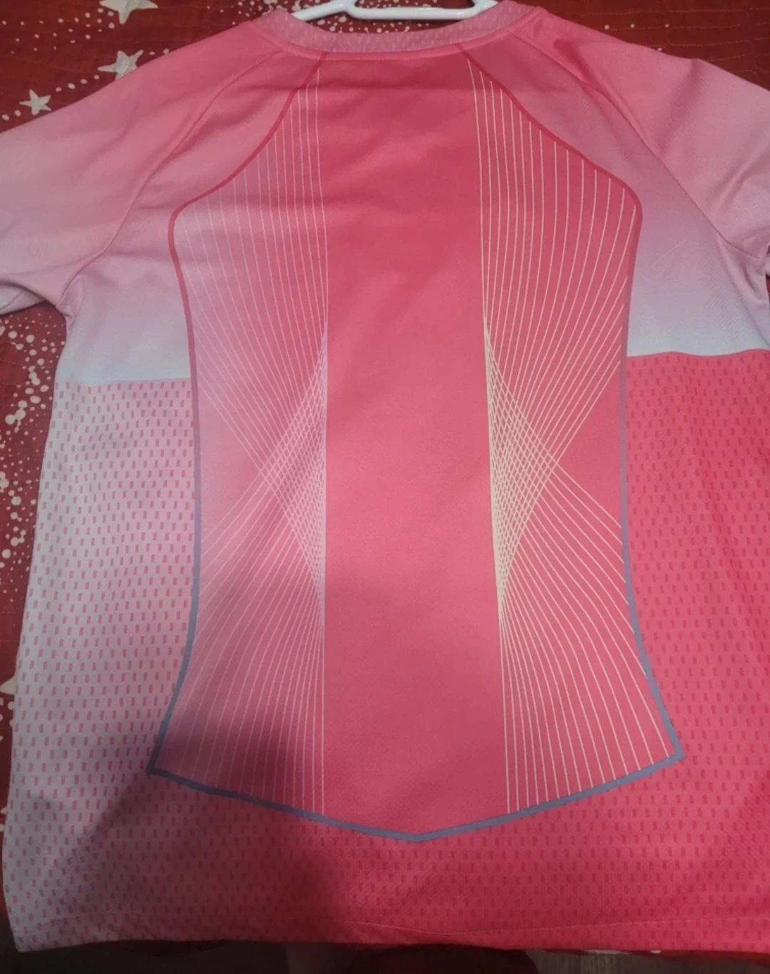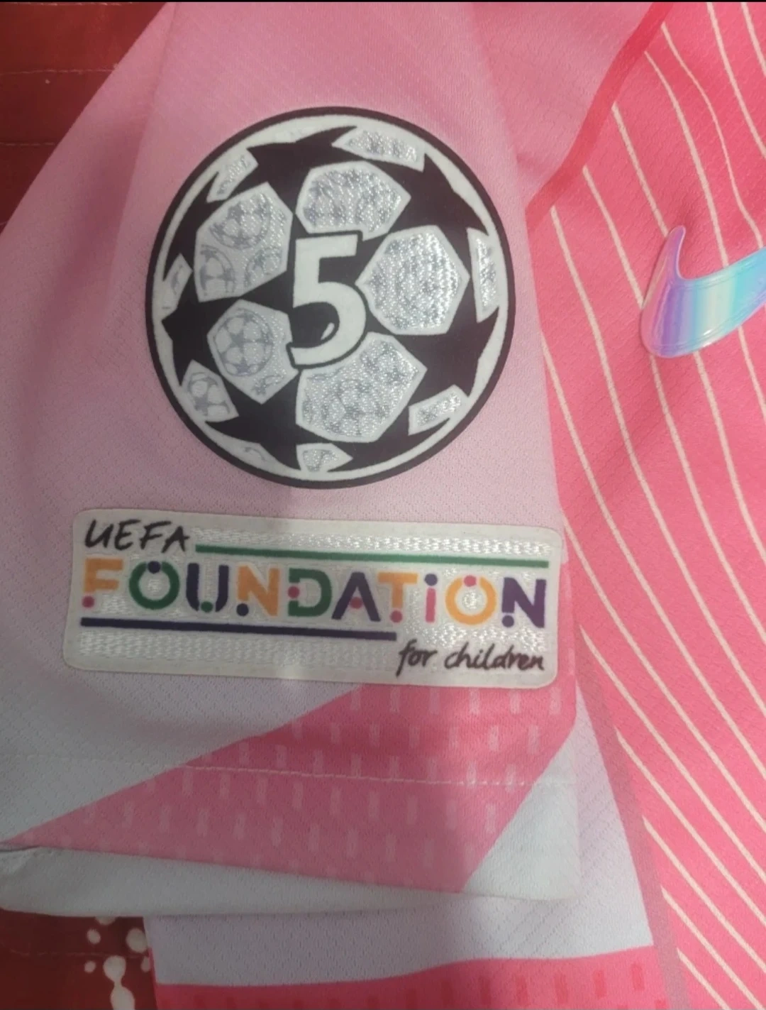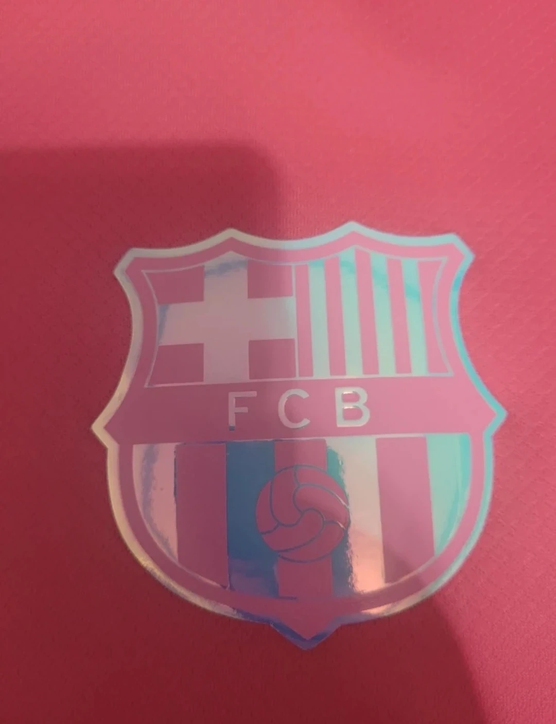 This is a Nike FC Barcelona 2023/24 third jersey in pink. It features the club crest, Spotify logo and champions league logo. Lightweight and breathable fabric. Men's L size.