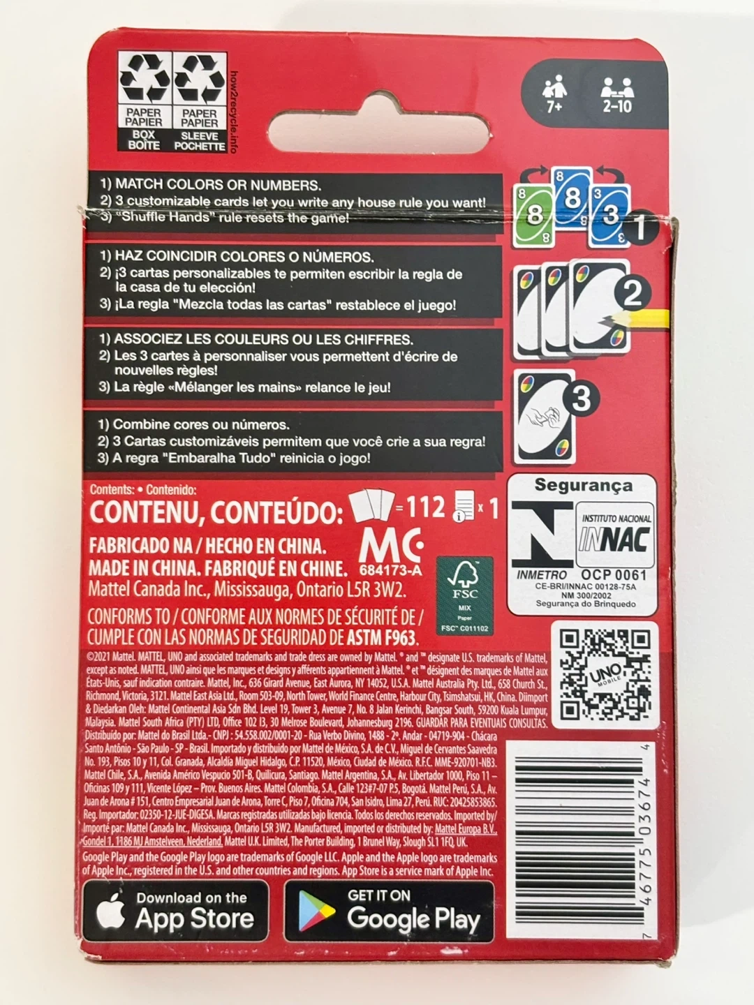 UNO card game with customizable wild cards. Includes 112 cards. Recommended for ages 7+ and 2-10 players. A fun game for the whole family!