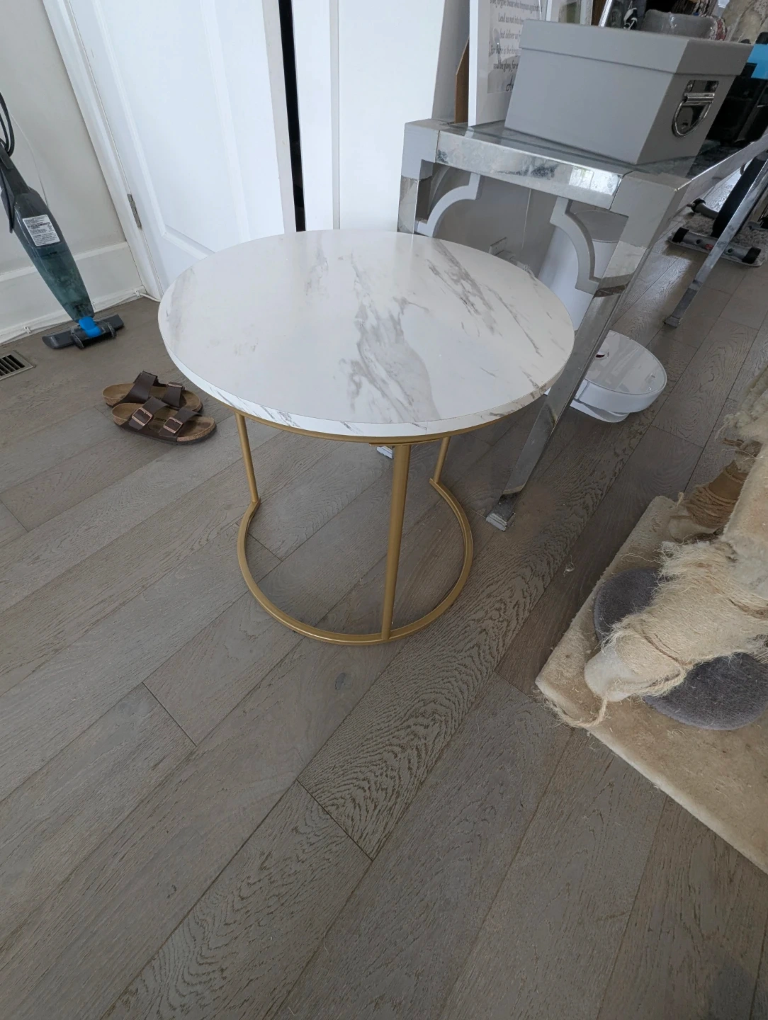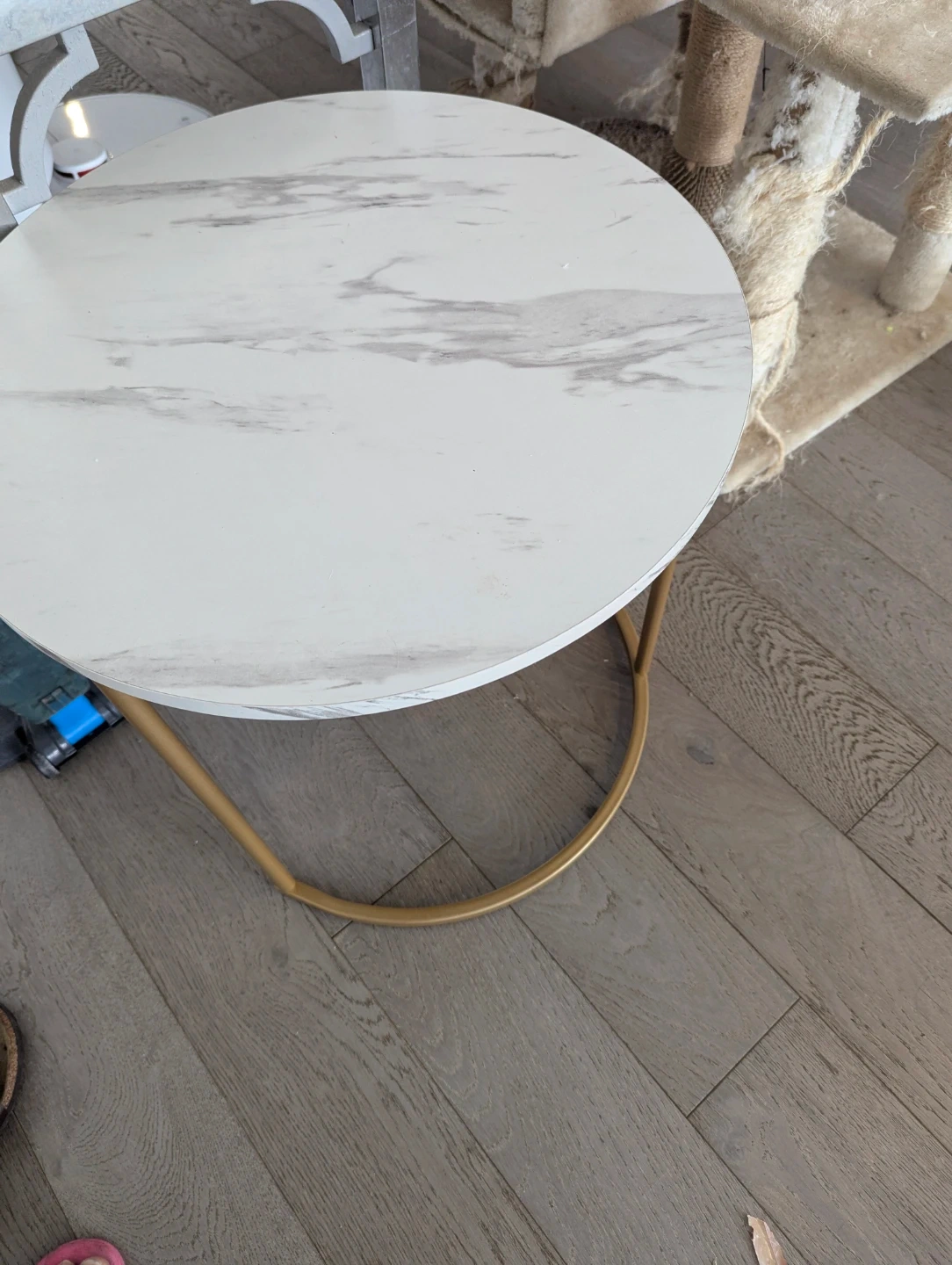 A modern accent table with a marble-look top and gold metal legs. This table's compact size makes it great for small spaces. Its curved base adds a stylish touch.