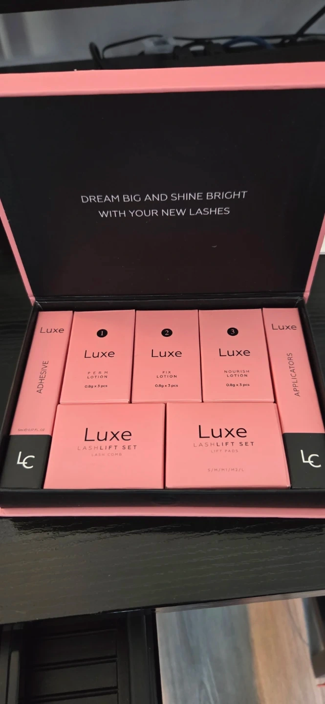 This is the Luxe Lash Lift Set for achieving dream lashes. It includes adhesive, perm lotion, fix lotion, and nourish lotion. Applicators are also included. 3 application included.