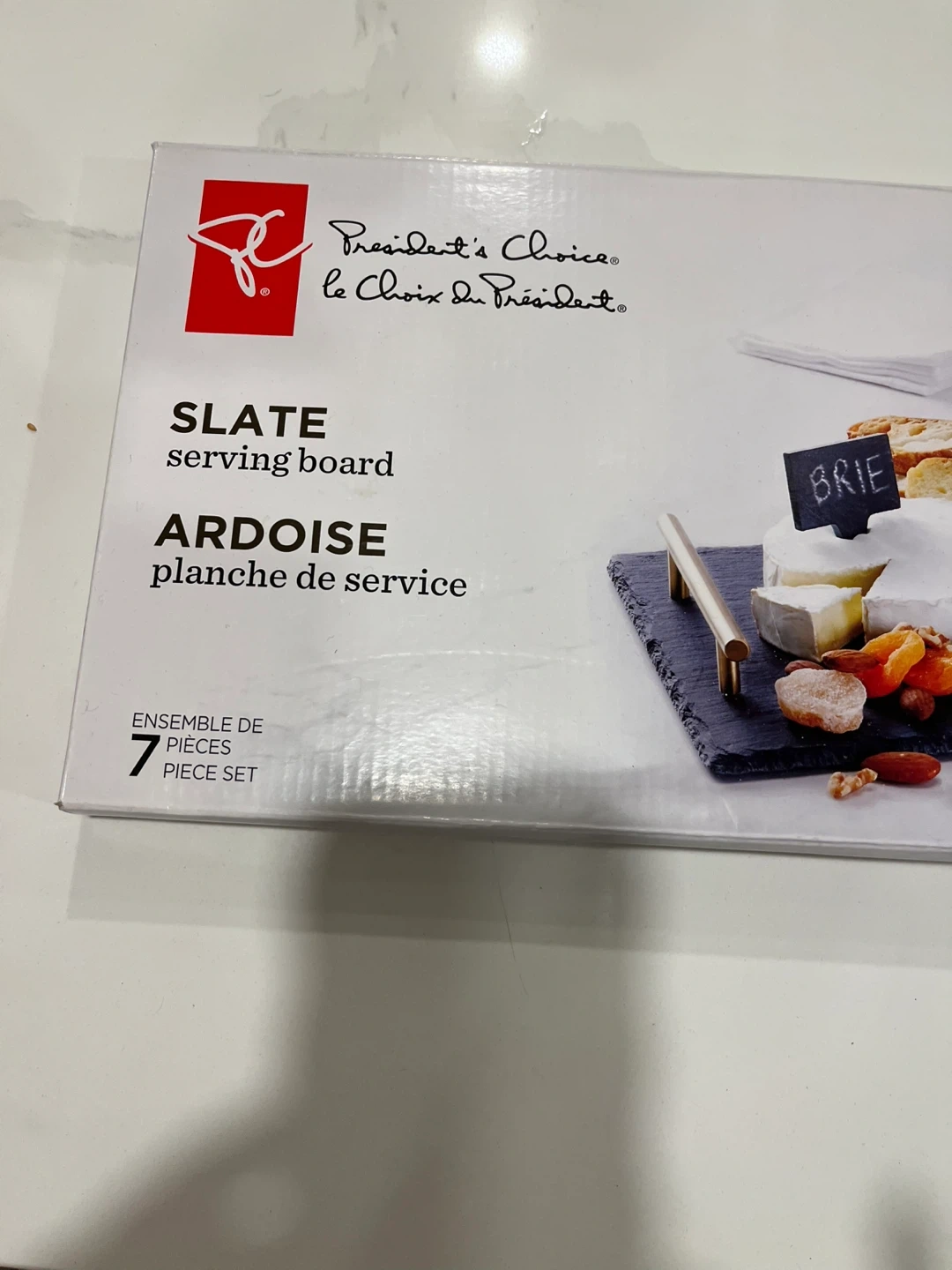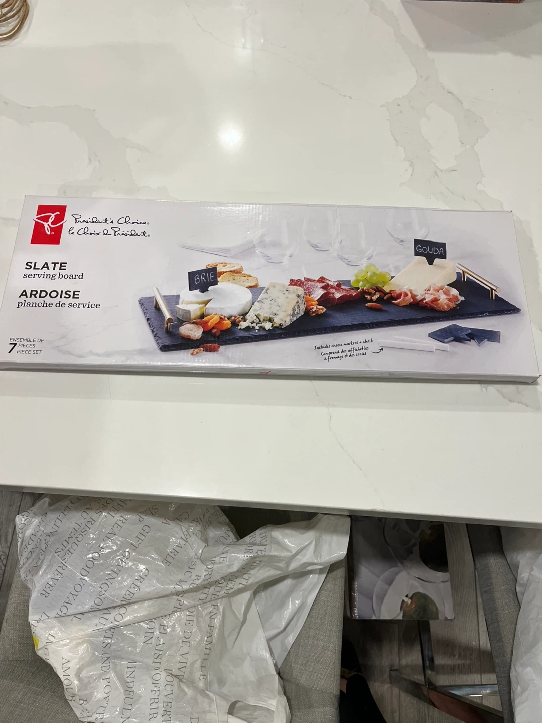 Selling a President's Choice slate serving board set. It's a 7-piece set, perfect for entertaining! Includes cheese markers and chalk for labeling cheeses or charcuterie. Add a touch of quality and glamour to your serving experience - brand new never opened