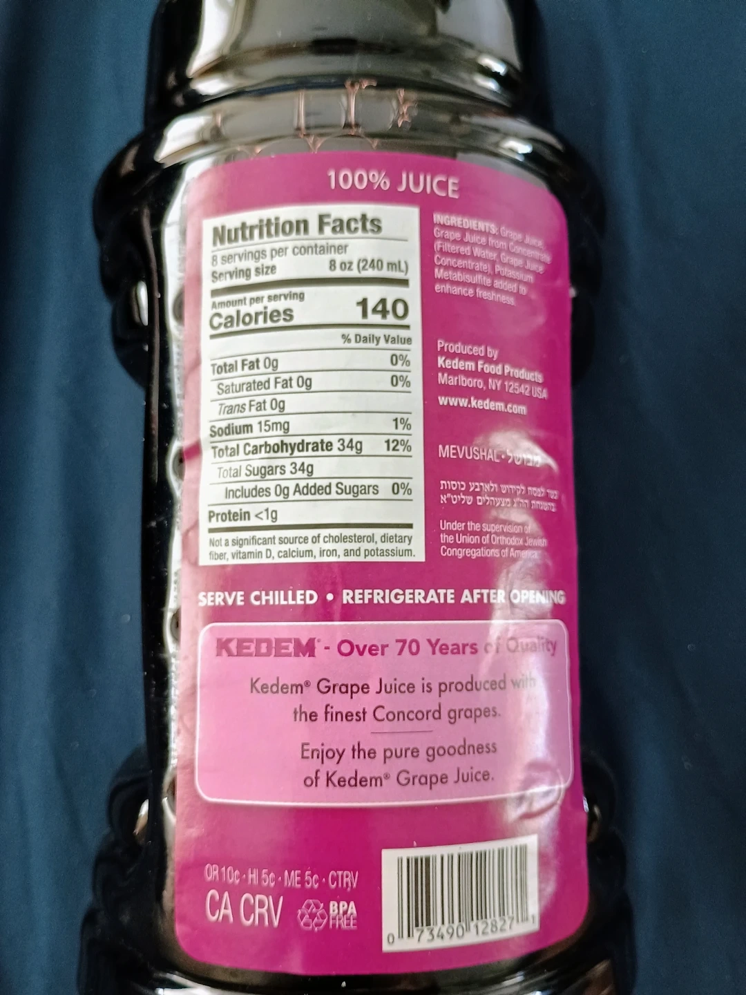 Kedem 100% Grape Juice made with concord grapes. It contains no sugar, coloring, or flavoring added. This bottle is 64 fl. oz. (2 quarts) or 1.89 L.