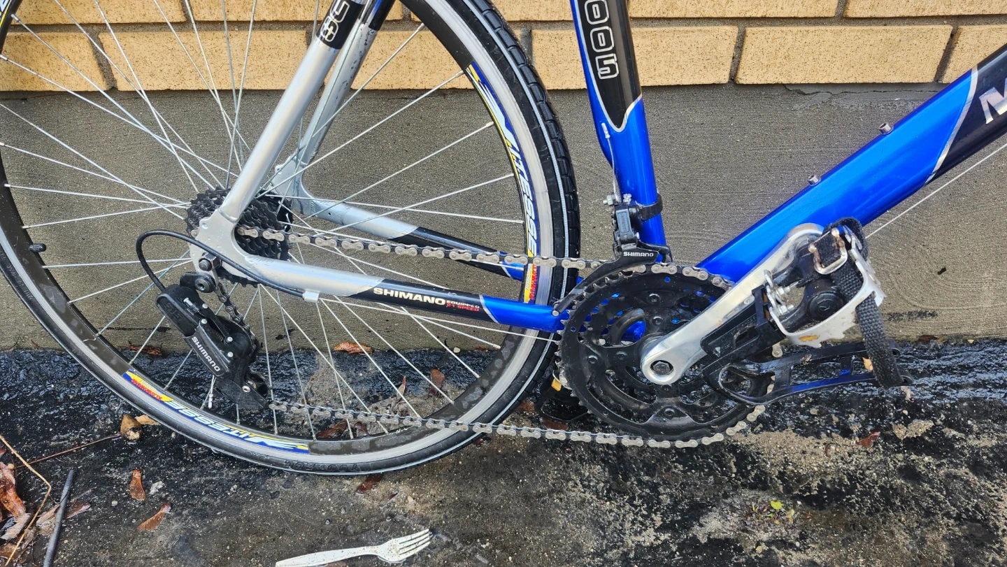 This is a blue road bike featuring Shimano components and 21 speeds. It's equipped with caliper brakes, new jockey wheels, and just lubed the chain. Includes straps aswell.