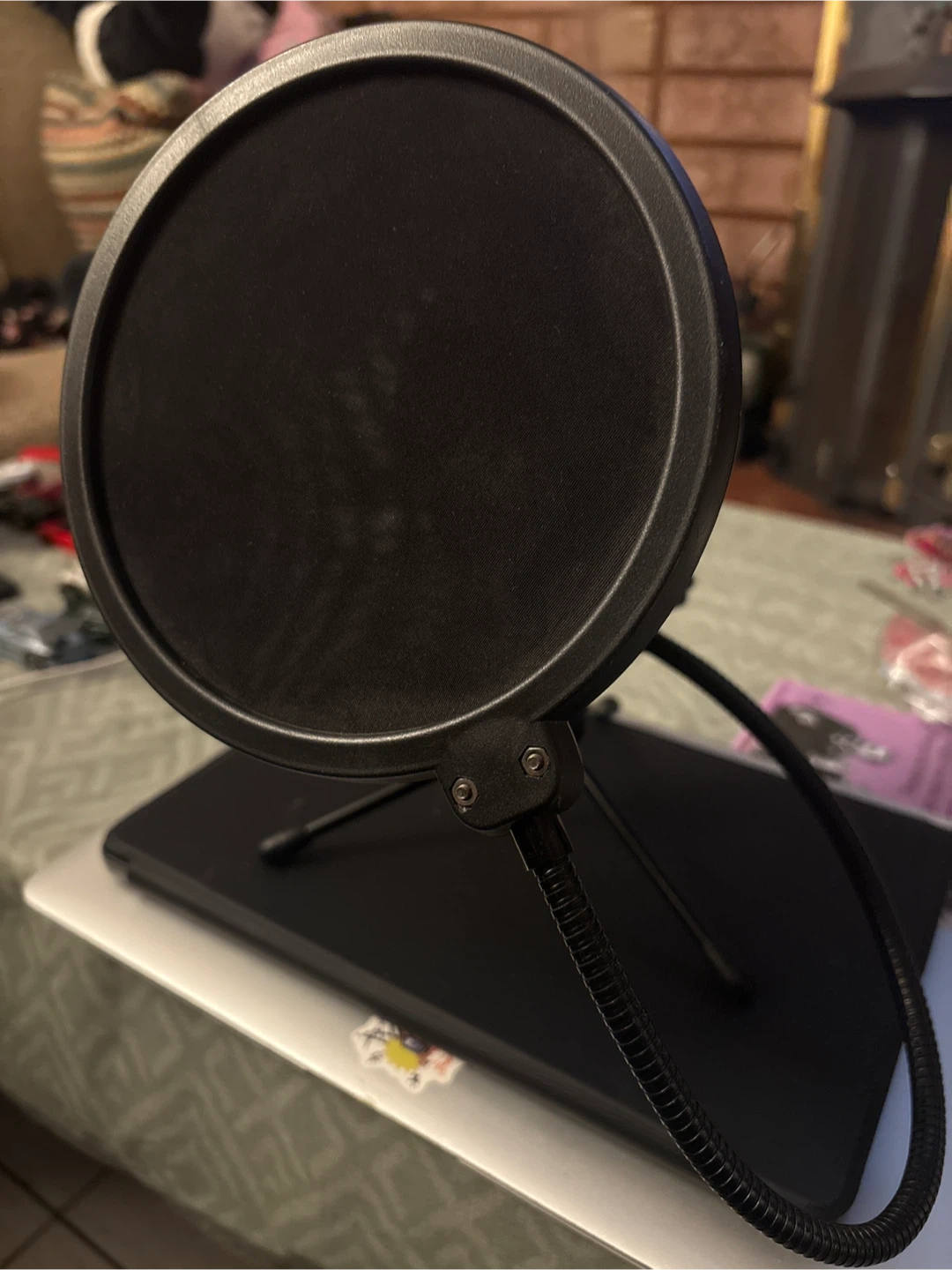 This is a Blue Snowball iCE USB microphone, perfect for voiceovers or podcasts. It's got a compact design and comes with a pop filter to improve audio quality. It's an easy-to-use microphone for capturing clear sound.