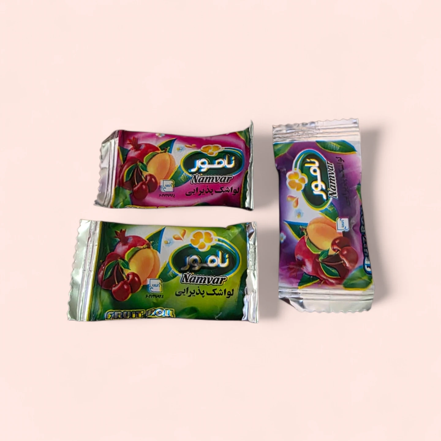 Three Namvar fruit roll-ups are included. These snacks feature a fruit flavour. They're individually wrapped for convenience.