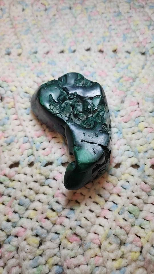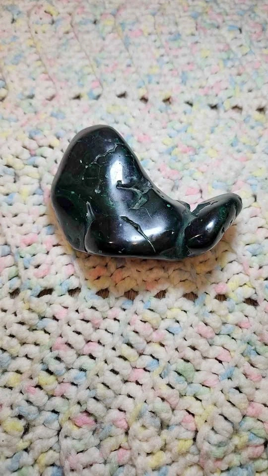 Unique dark green malachite polished stone with cool natural patterns. Great for home decor or a crystal collection. 11.3 oz weight. 3.75" X 3.25".