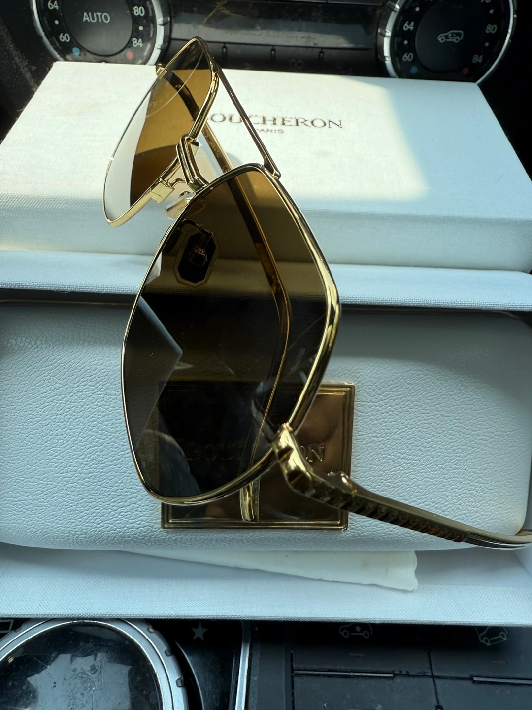 Selling a pair of Boucheron sunglasses with gold frames. They come with the original box and case. These sunglasses are in great condition and ready for a new owner!