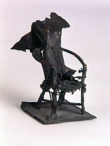 This is a unique abstract bronze sculpture by the late Italian artist Wilfried Senoner. It's made of bronze with a dark, distressed finish. The piece depicts a figure seated in a chair constructed from rough materials.