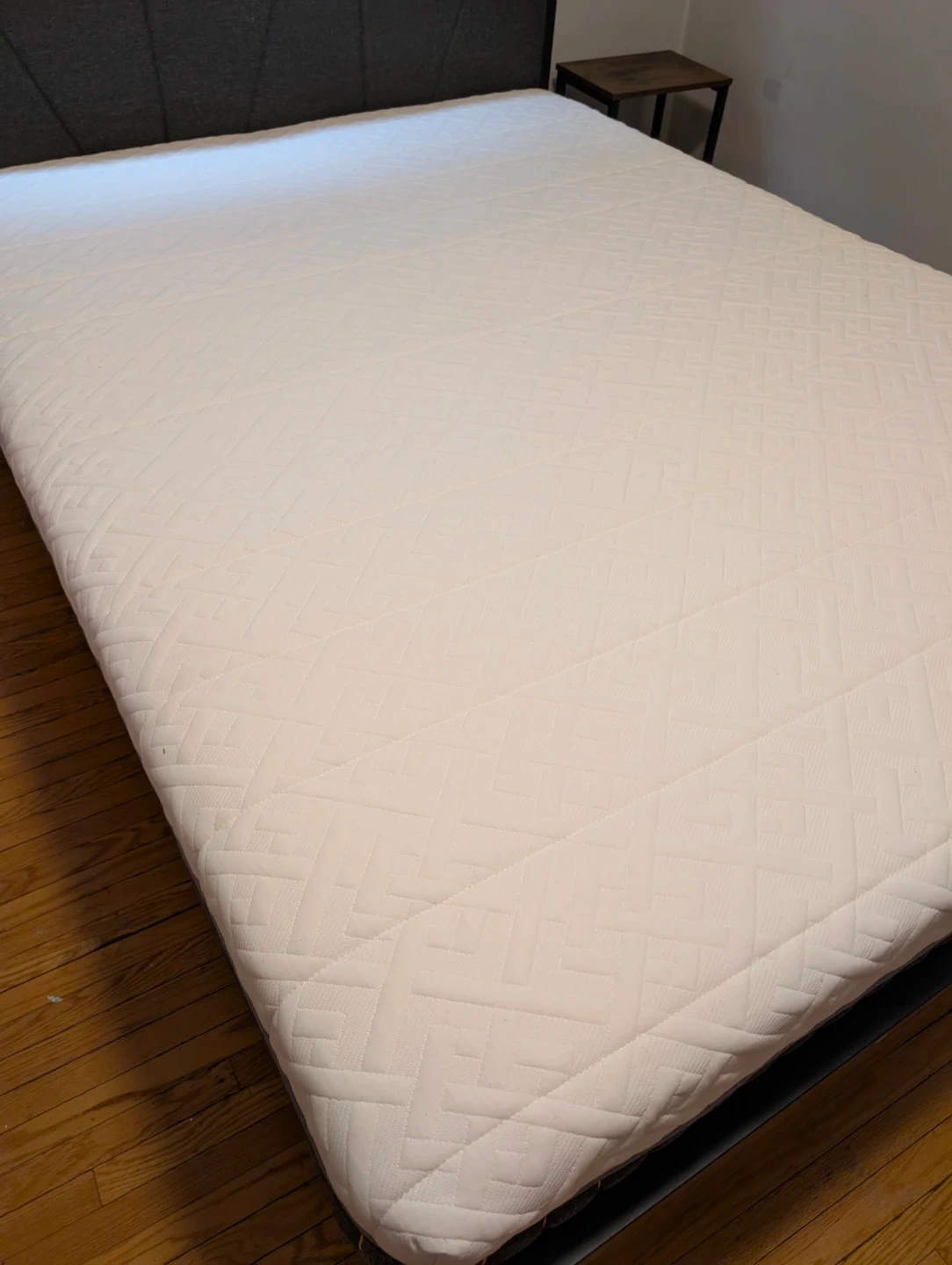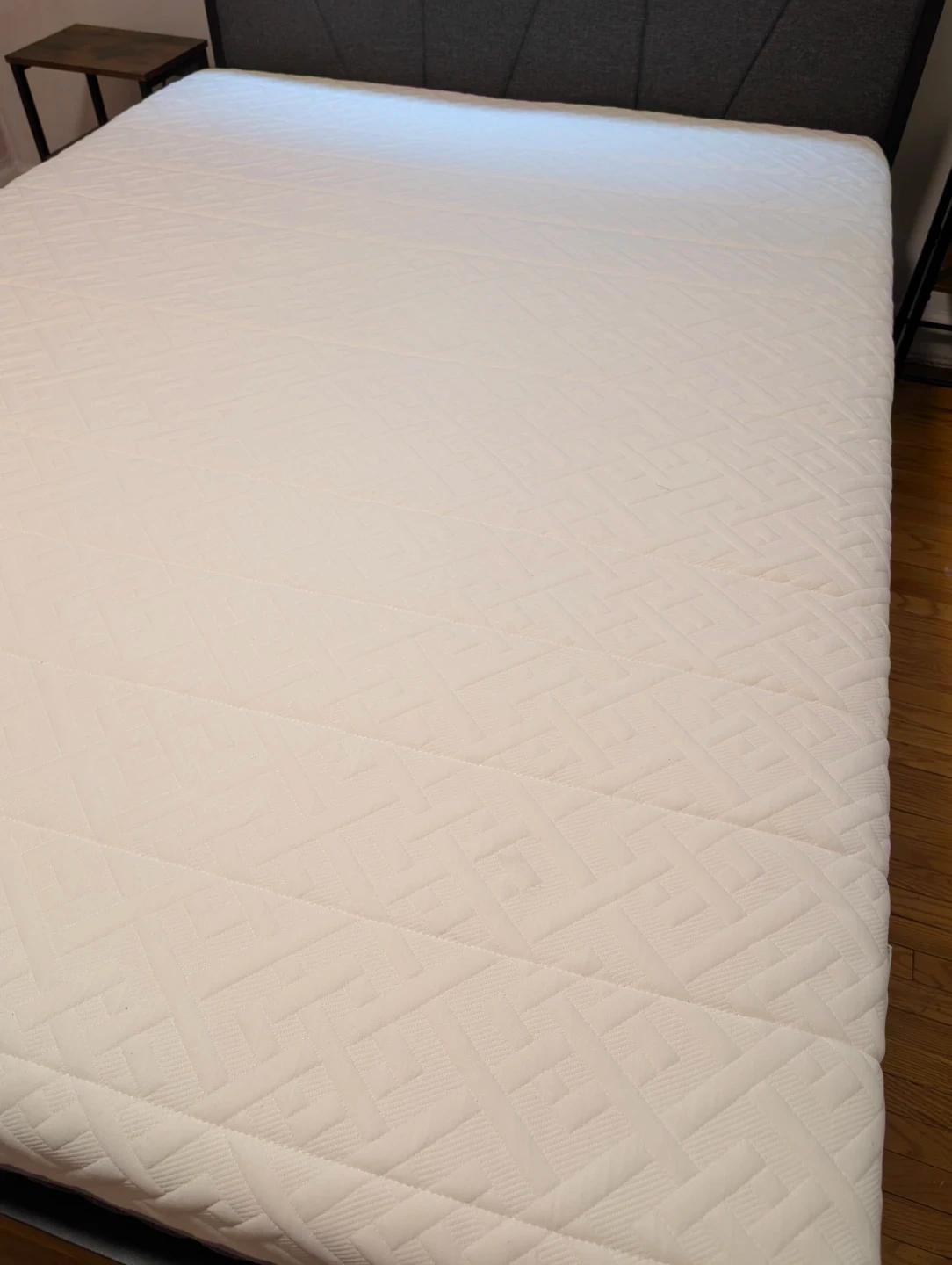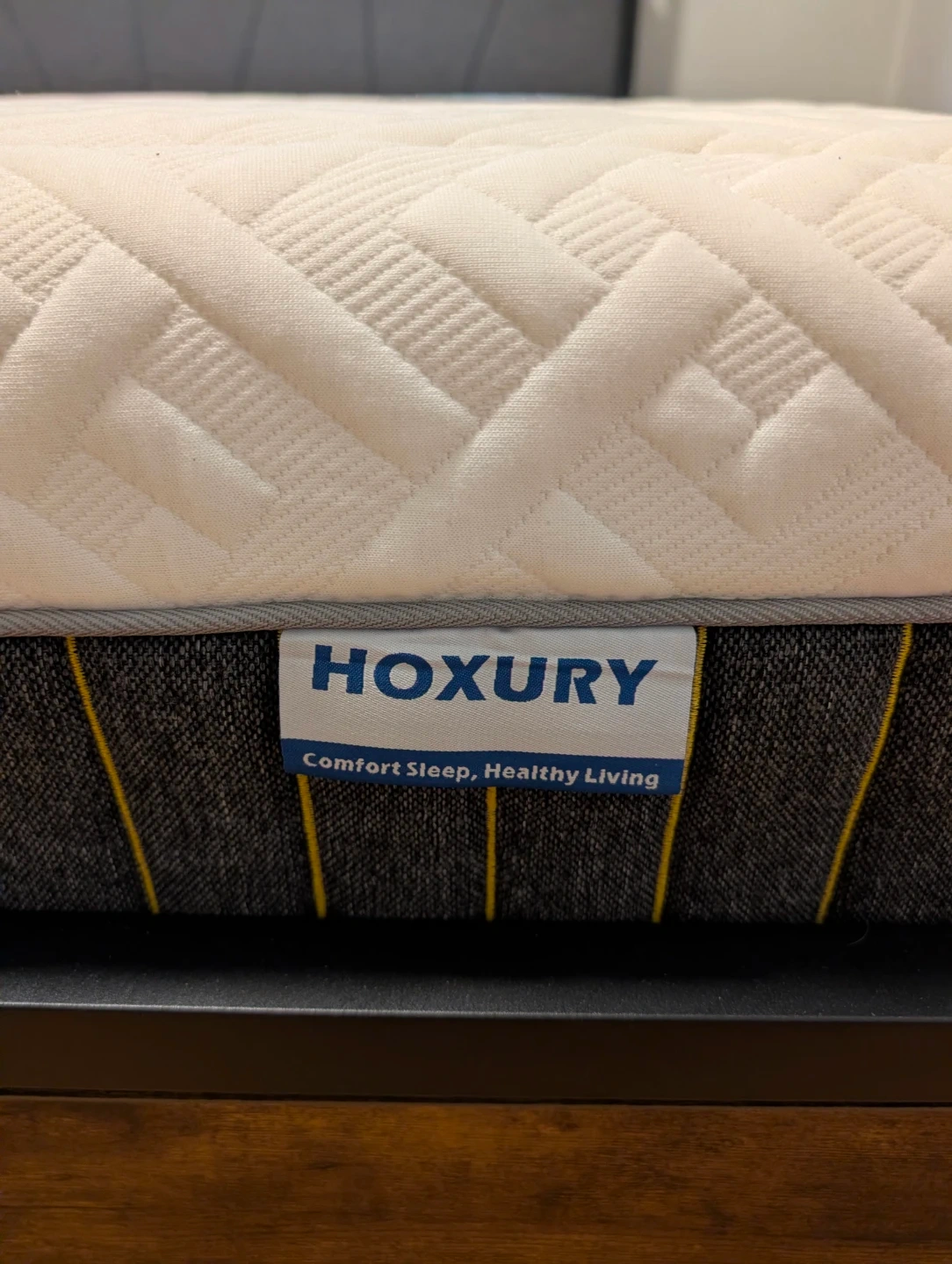 This is a HOXURY queen-sized mattress. It's a 10-inch memory foam mattress. It features a quilted top with a geometric pattern.