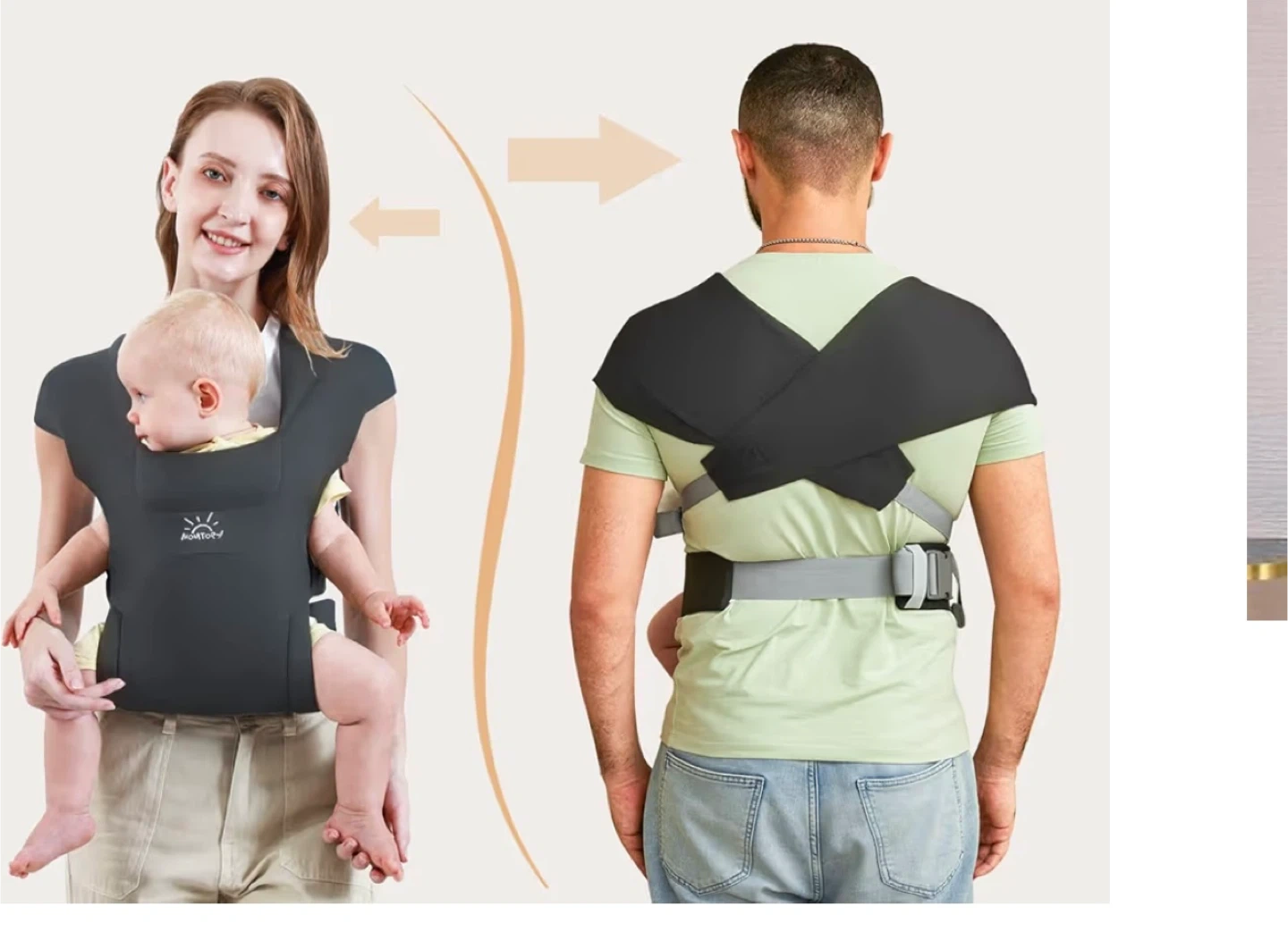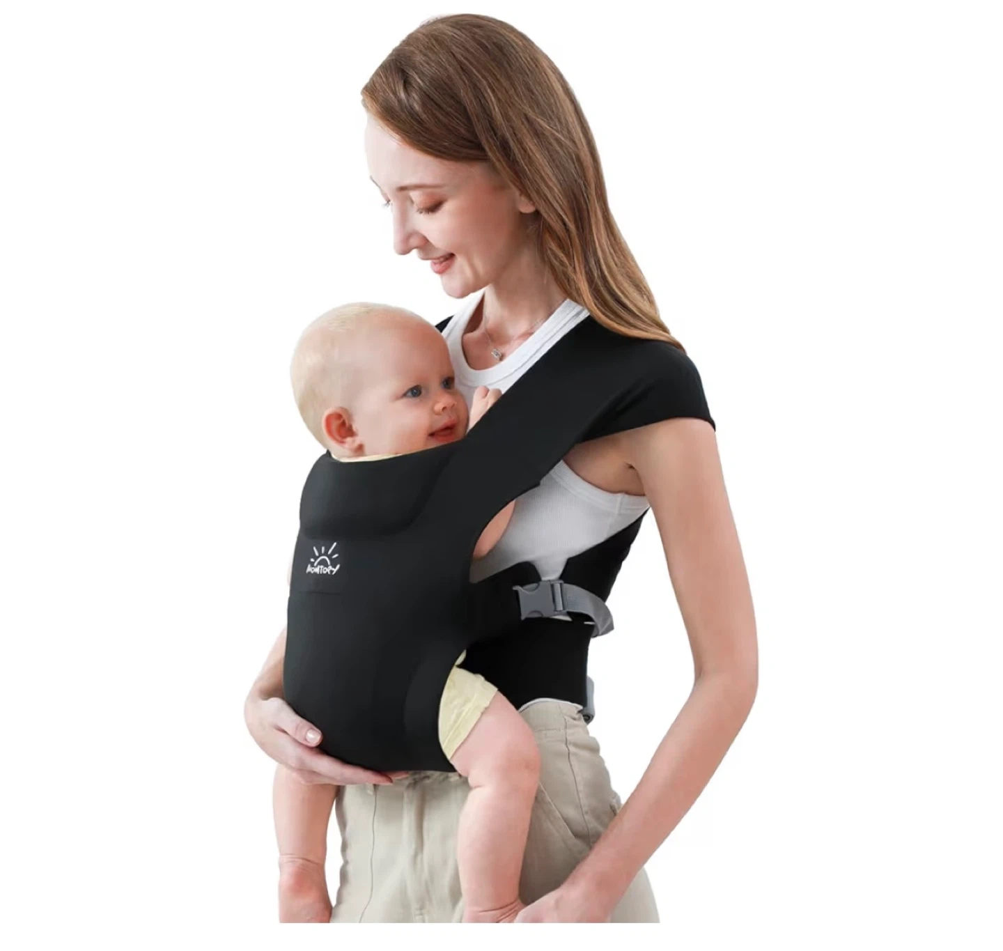 This baby carrier is black and has adjustable straps. It features a supportive hip belt for comfort. It's designed for carrying infants.