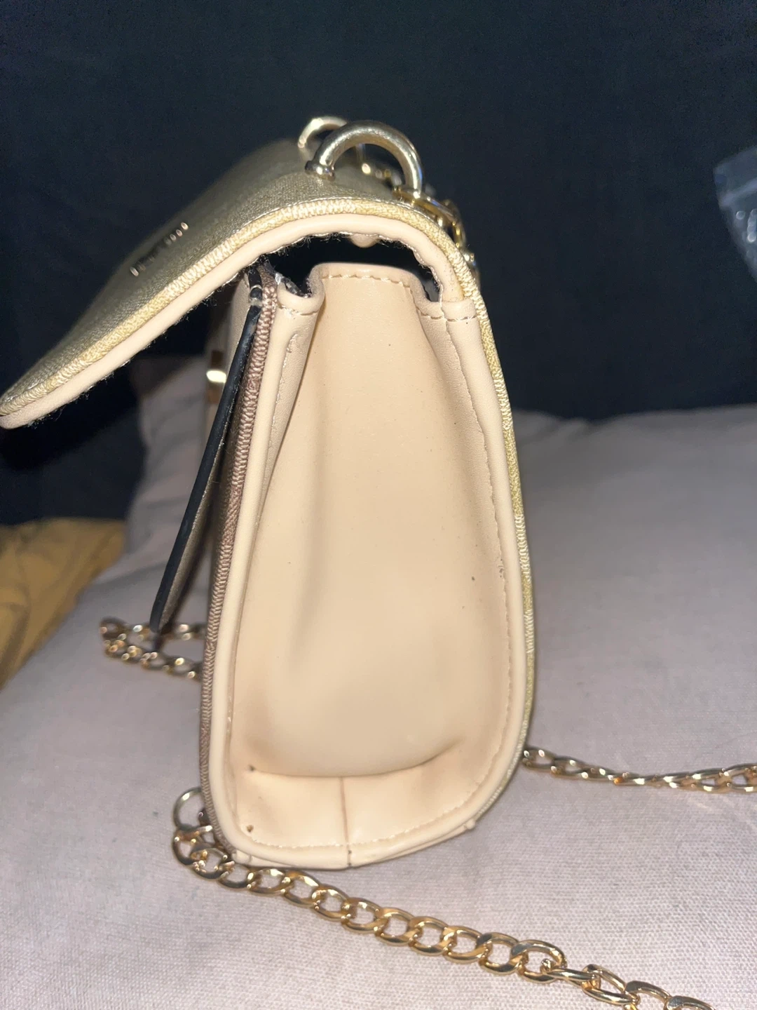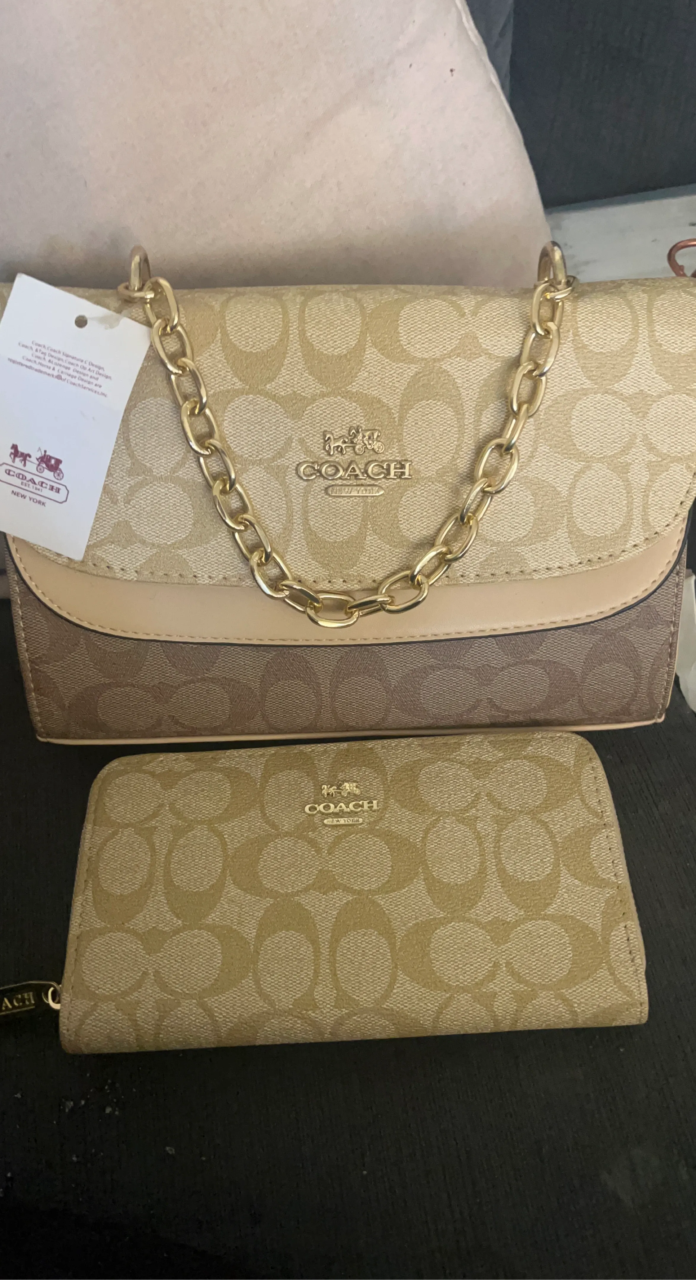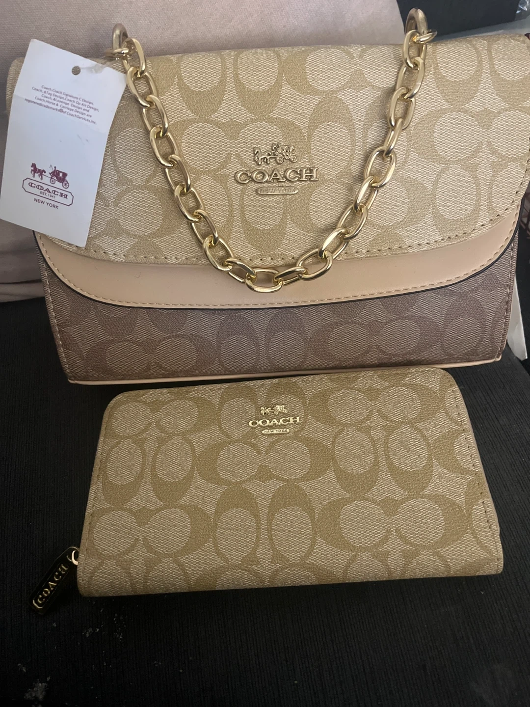 This Coach set includes a signature C print wallet and a matching crossbody bag. Both pieces feature the classic Coach logo and gold-tone hardware. The bag has a chic chain strap.