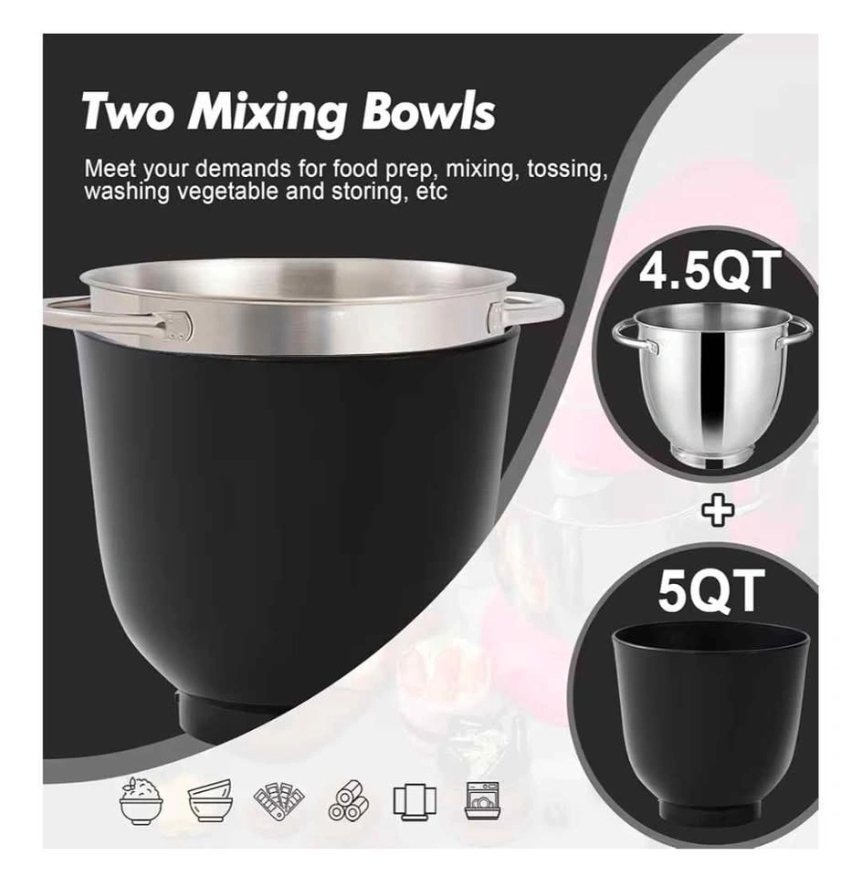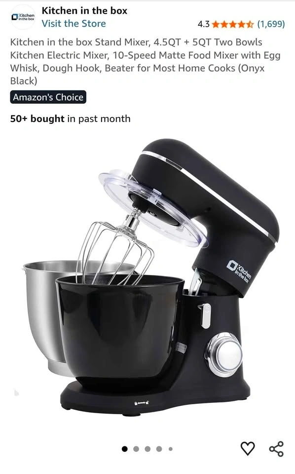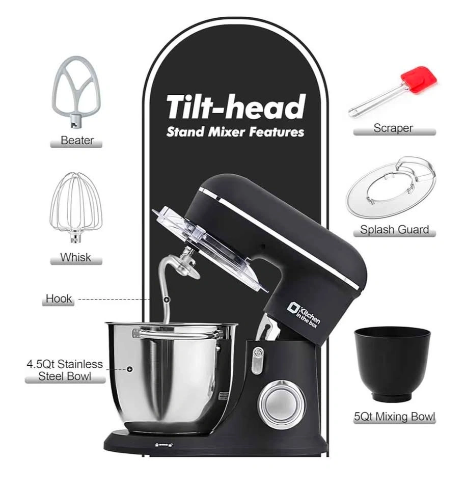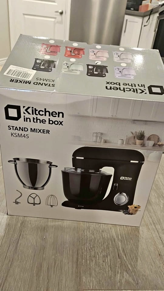 Completely new, still in box and items individually wrapped in plastic packaging, hasn't even been opened! Kitchen in the box Stand Mixer in Onyx Black. Includes two bowls (4.5QT Steel + 5QT Plastic), 10-Speed electric mixer, egg whisk, dough hook, beater, scraper, and splash guard.