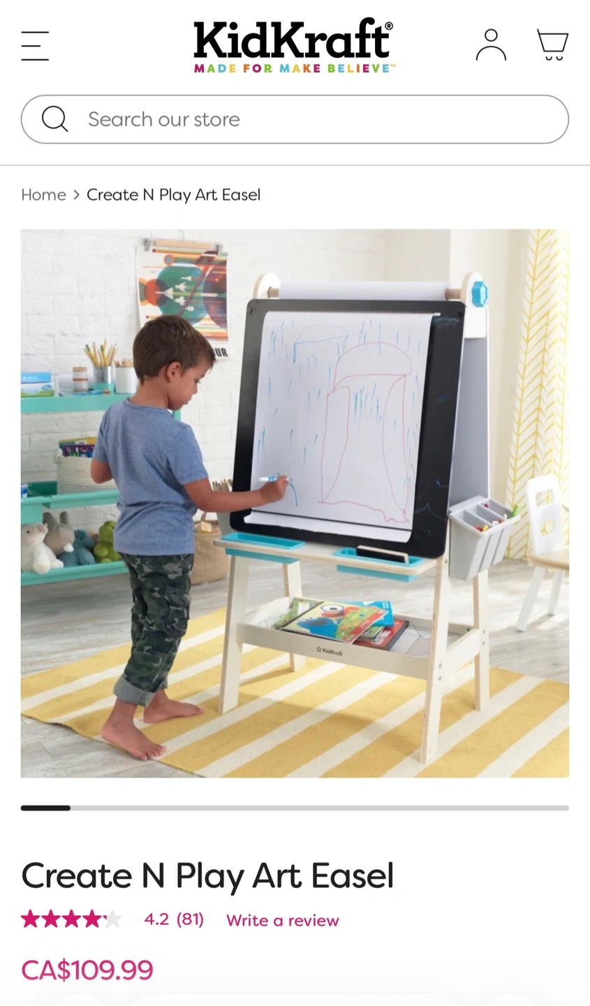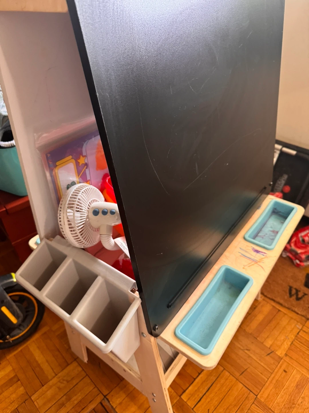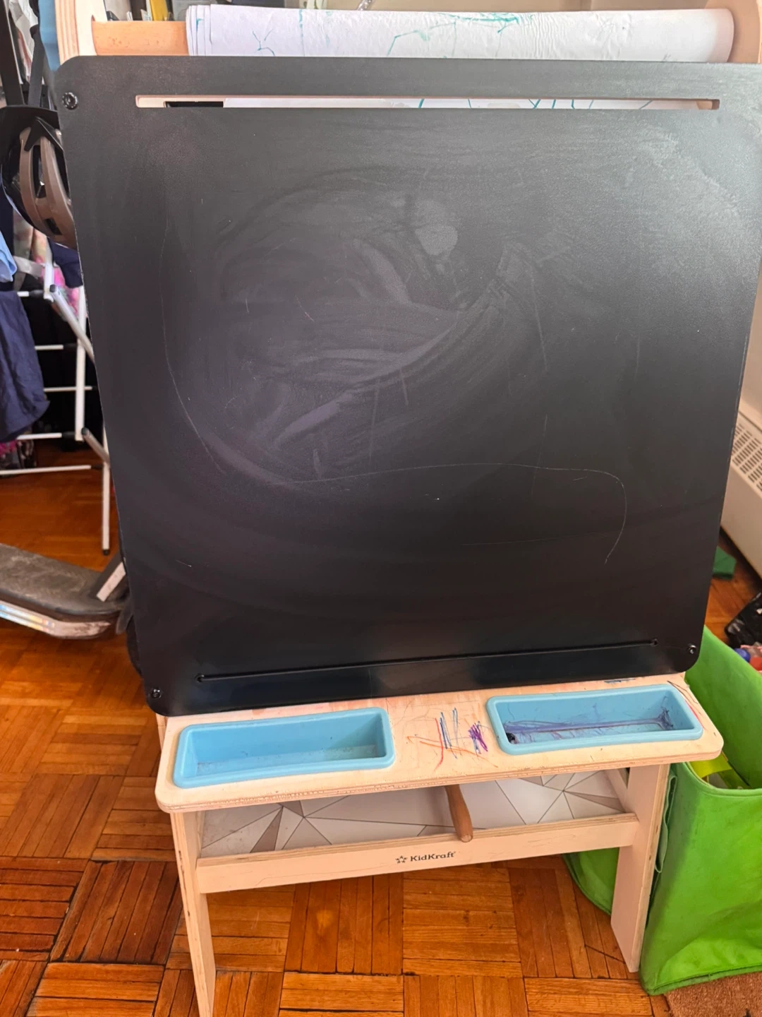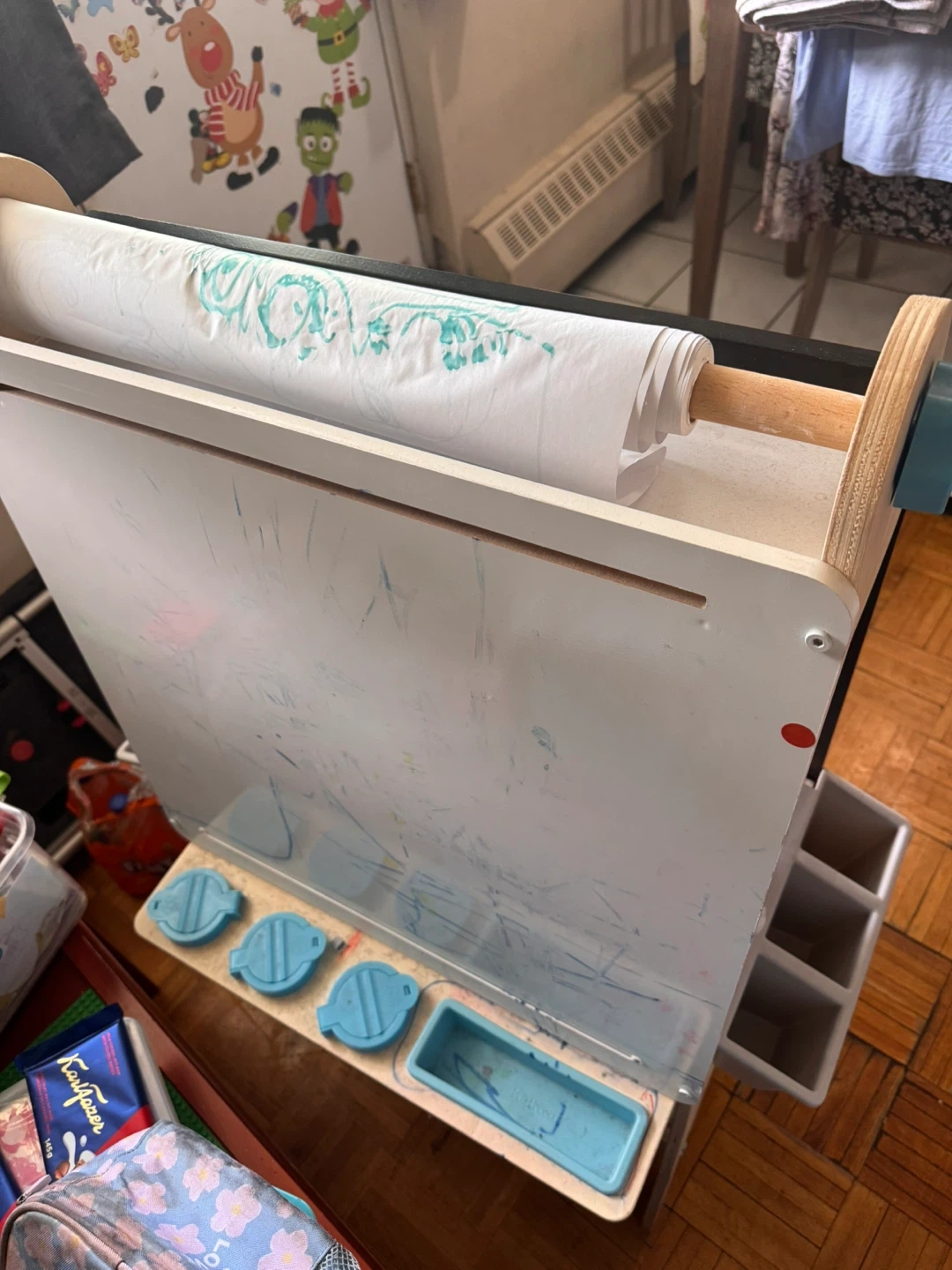This KidKraft art easel provides a fun space for creative activities. It includes a chalkboard and a paper roll holder with paper. Storage bins are built-in for art supplies.