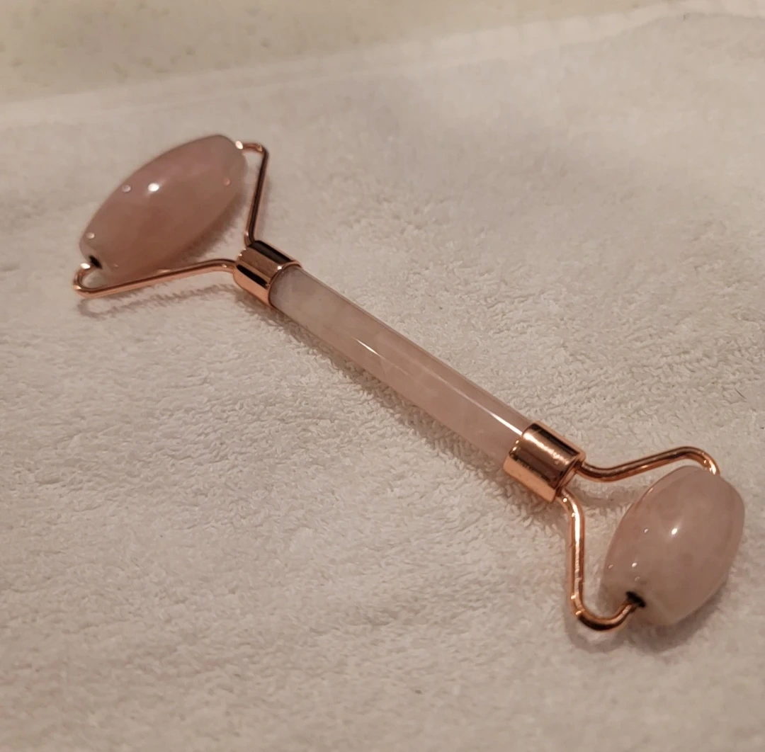 This rose quartz facial roller has a smooth rose gold finish. It's made from genuine rose quartz stone. Use it to help with facial massage and skincare application.