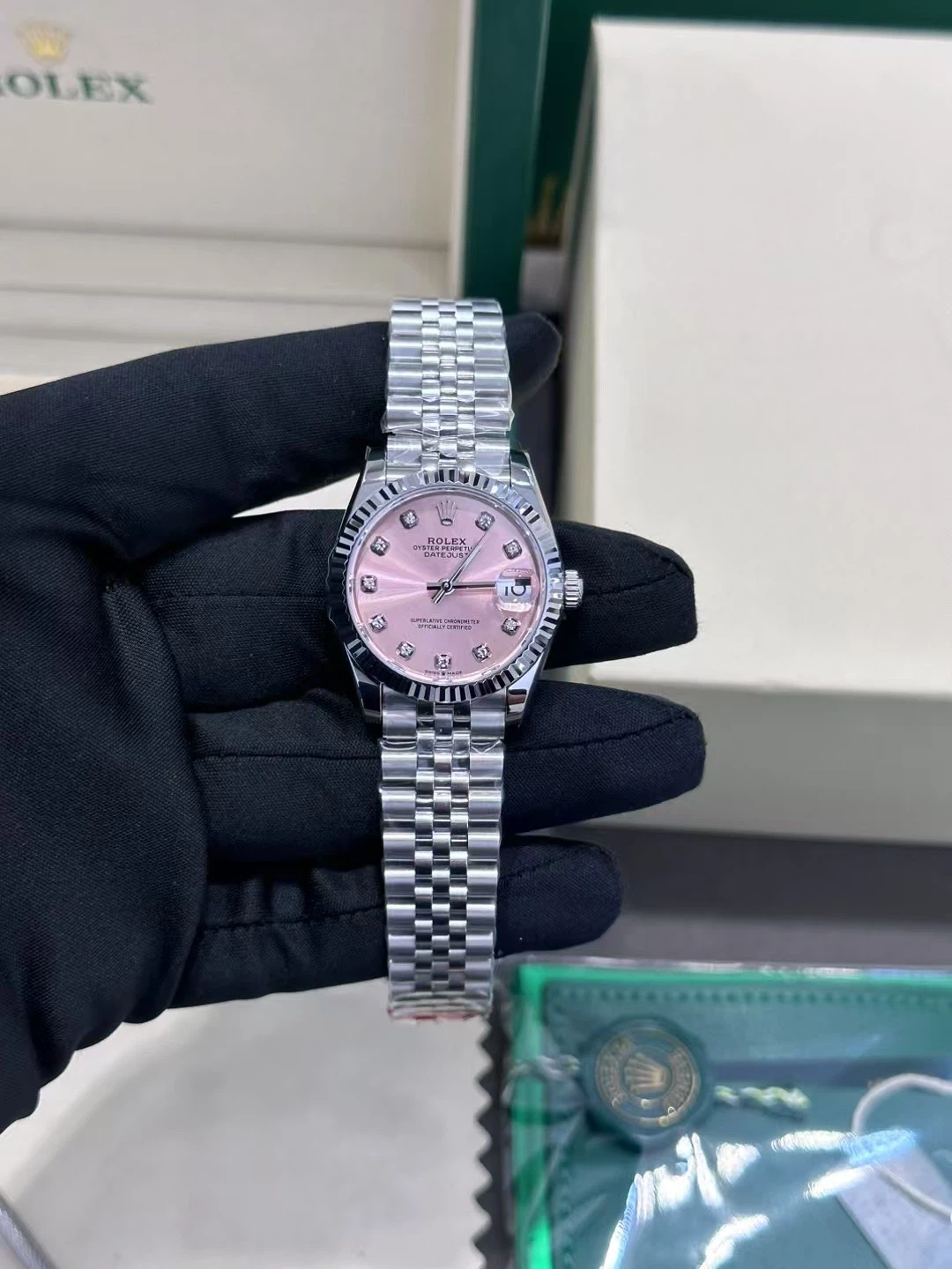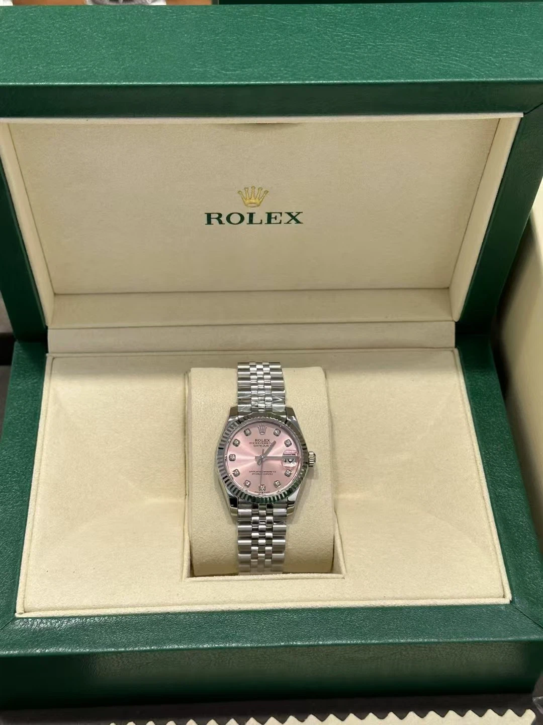 Authentic Rolex watch with a pink dial and diamond markers. It includes the original box, papers, and polishing cloth. This watch features a stainless steel Jubilee bracelet and automatic movement.