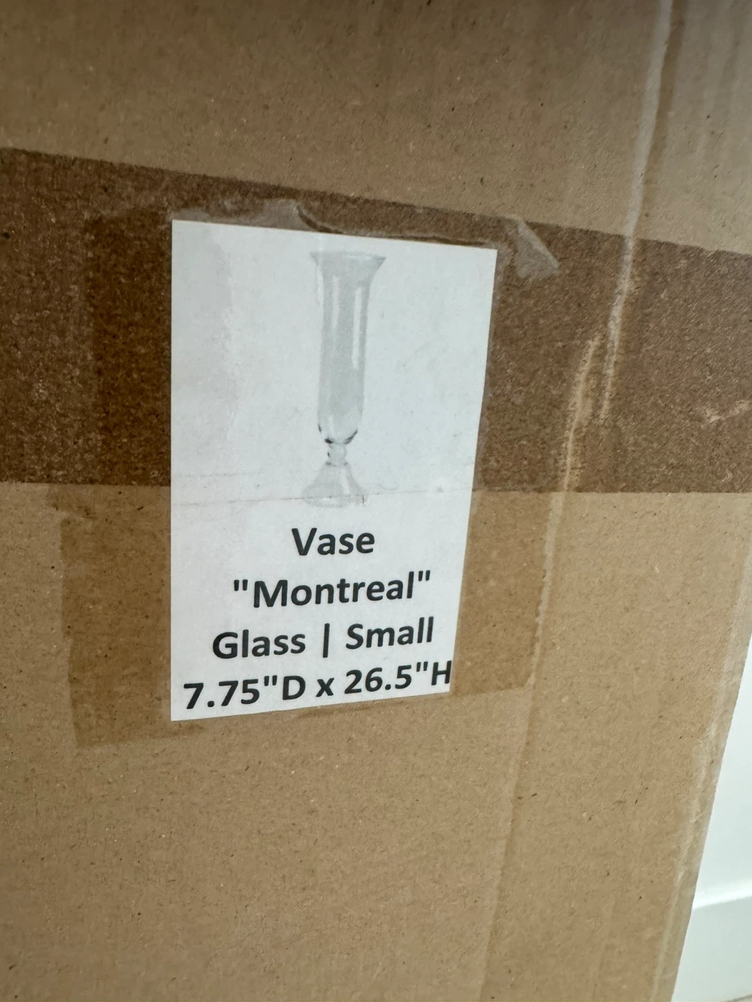 This is a glass vase called "Montreal". It's made of clear glass. The dimensions are 7.75" in diameter and 26.5" in height. It includes its original box.