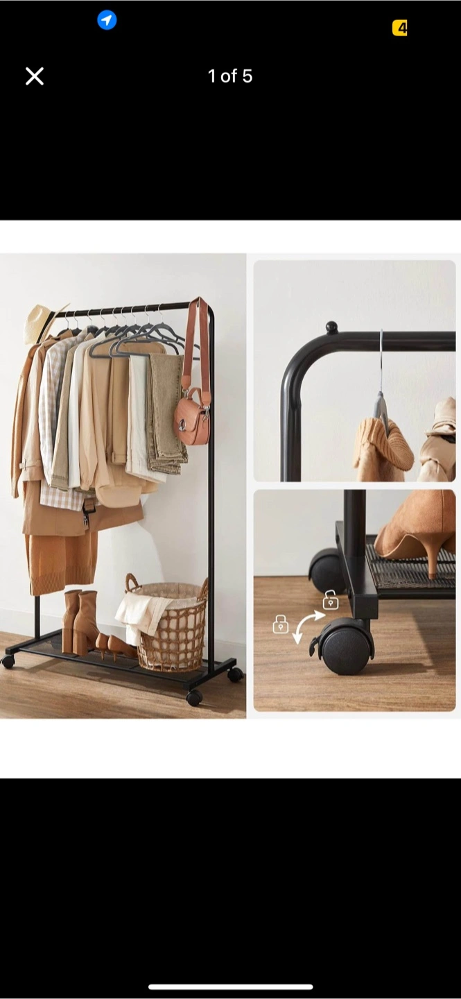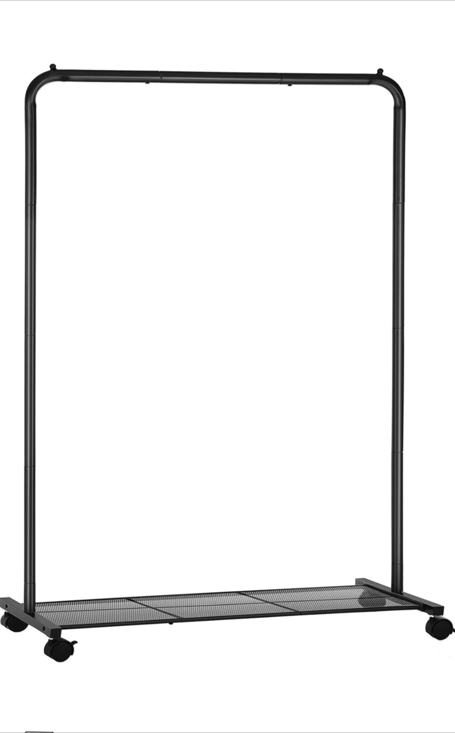 I'm selling this rolling garment rack. It features a top hanging bar and a mesh shelf below. The rack has four wheels for easy mobility. You can use it to organize your closet or create a small dressing area; it is a great item to purchase to help you feel more relaxed.