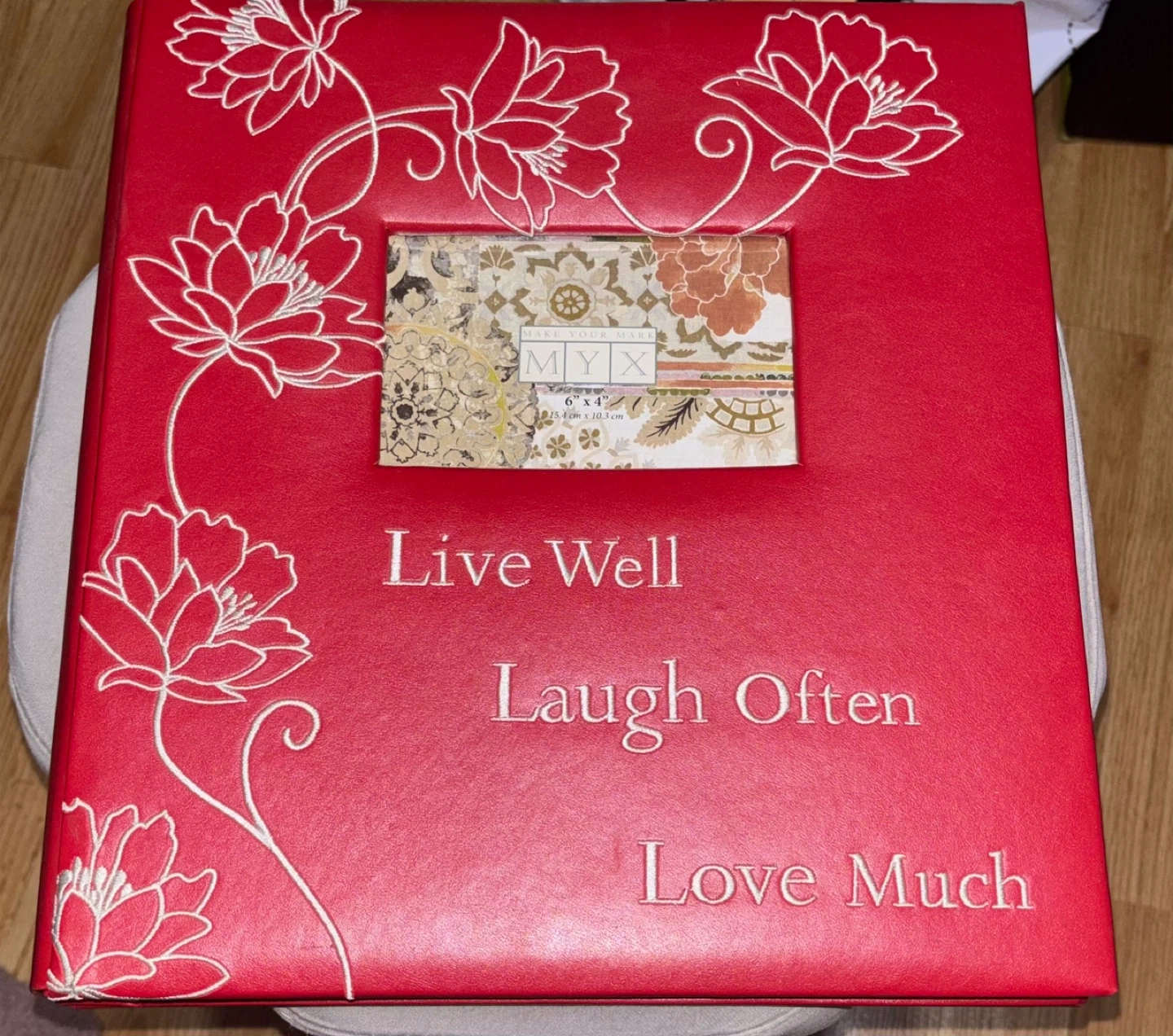 Red photo album with floral designs and a window for a picture. The album says 'Live Well, Laugh Often, Love Much'. The window for the picture is 6" x 4" or 15.4 cm x 10.3 cm