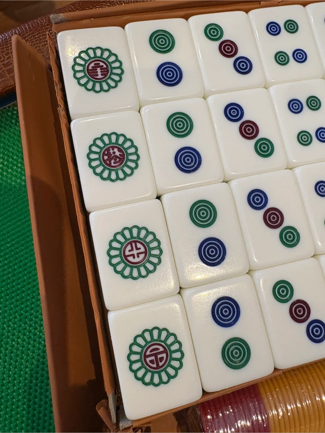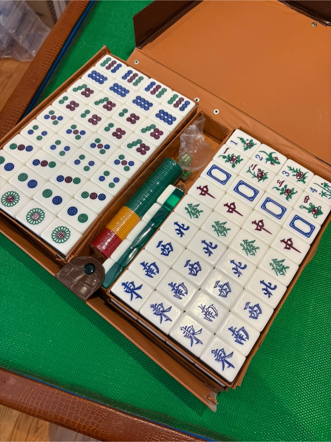 Mahjong set with tiles, dice, and chips included. The set comes in a folding case with a faux leather exterior.