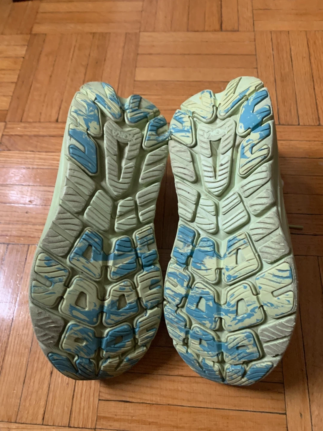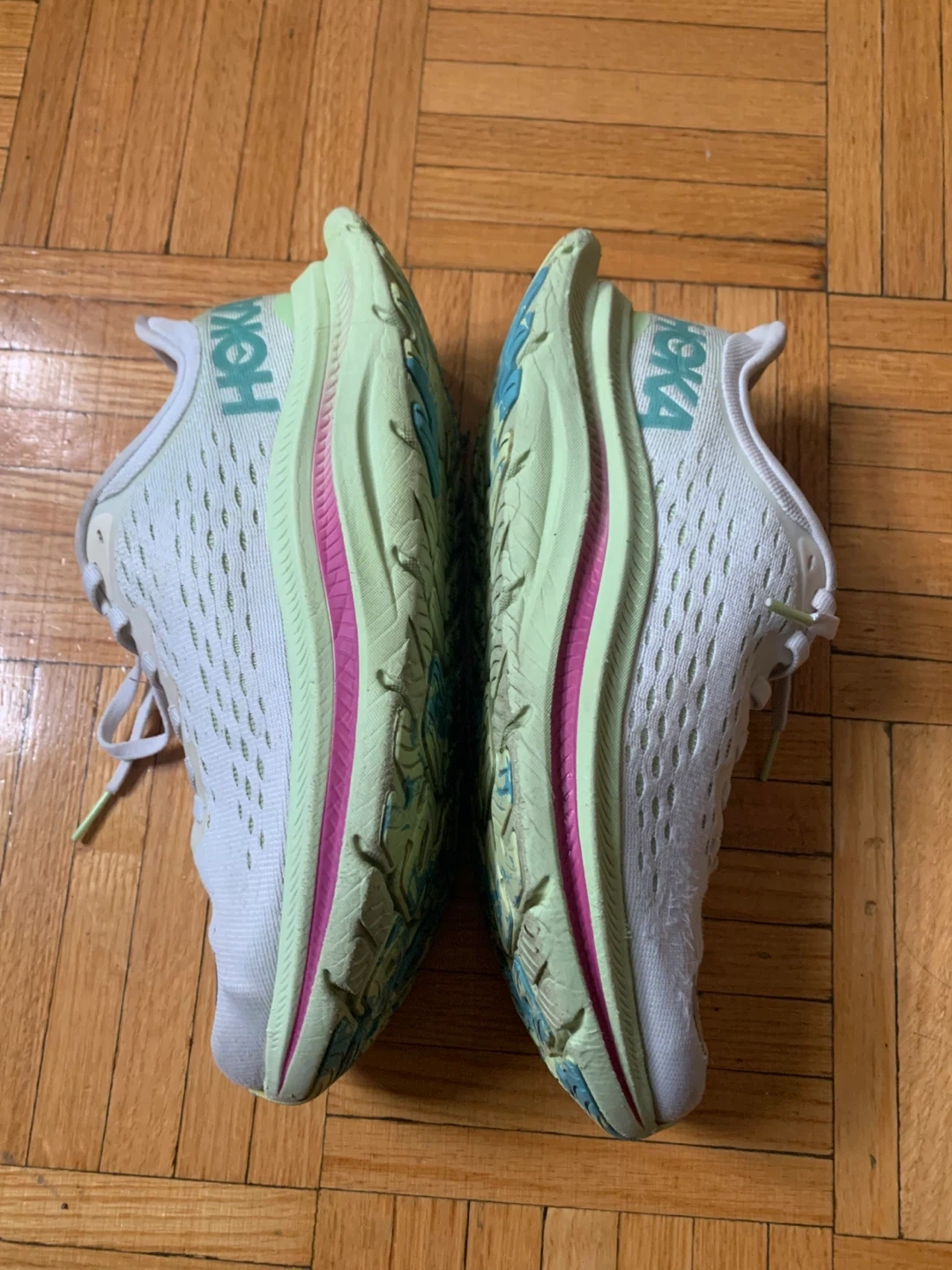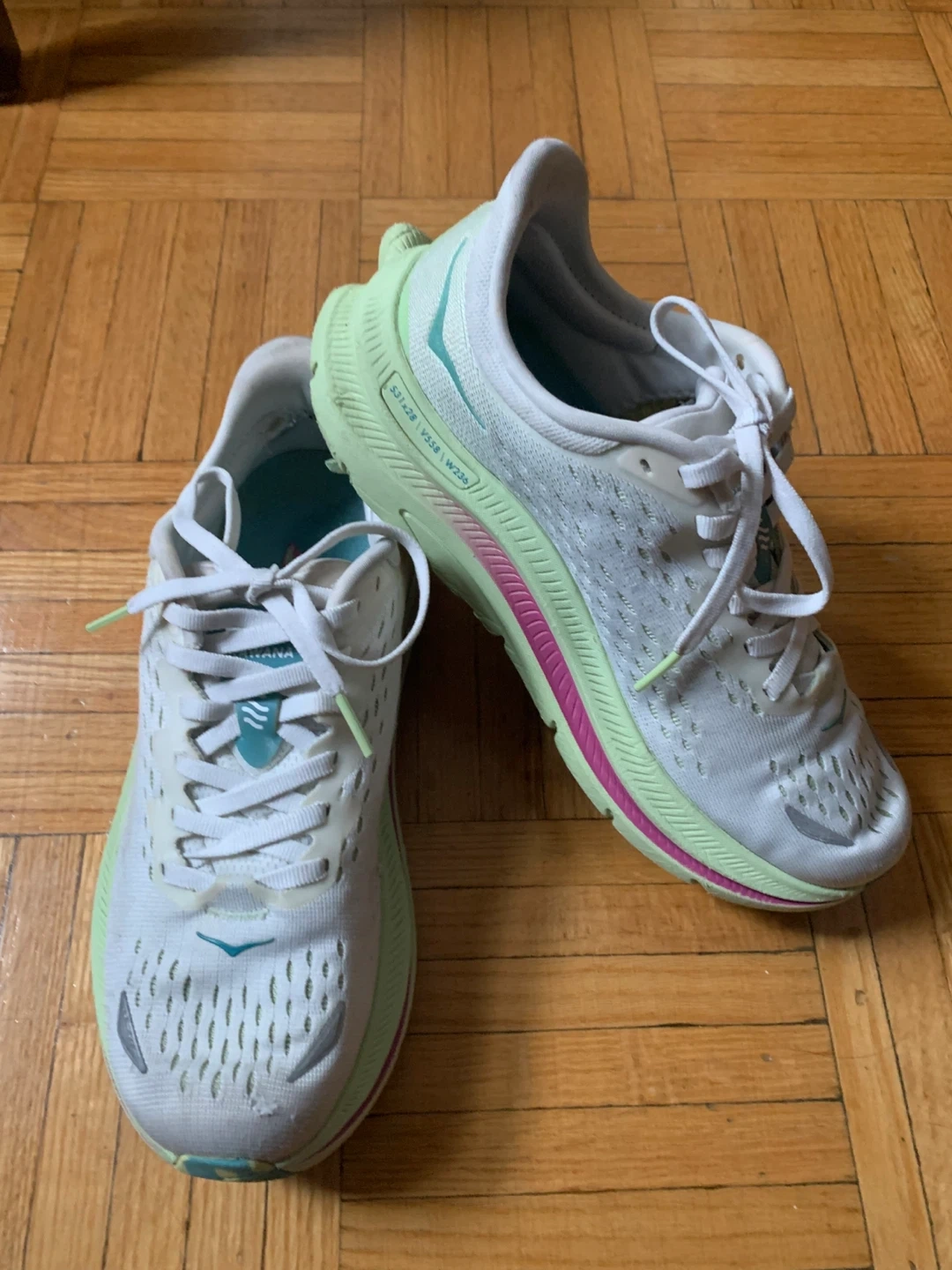 These Hoka running shoes are designed for comfort and performance. The white and light green colourway is stylish. They're perfect for hitting the pavement or the trail!