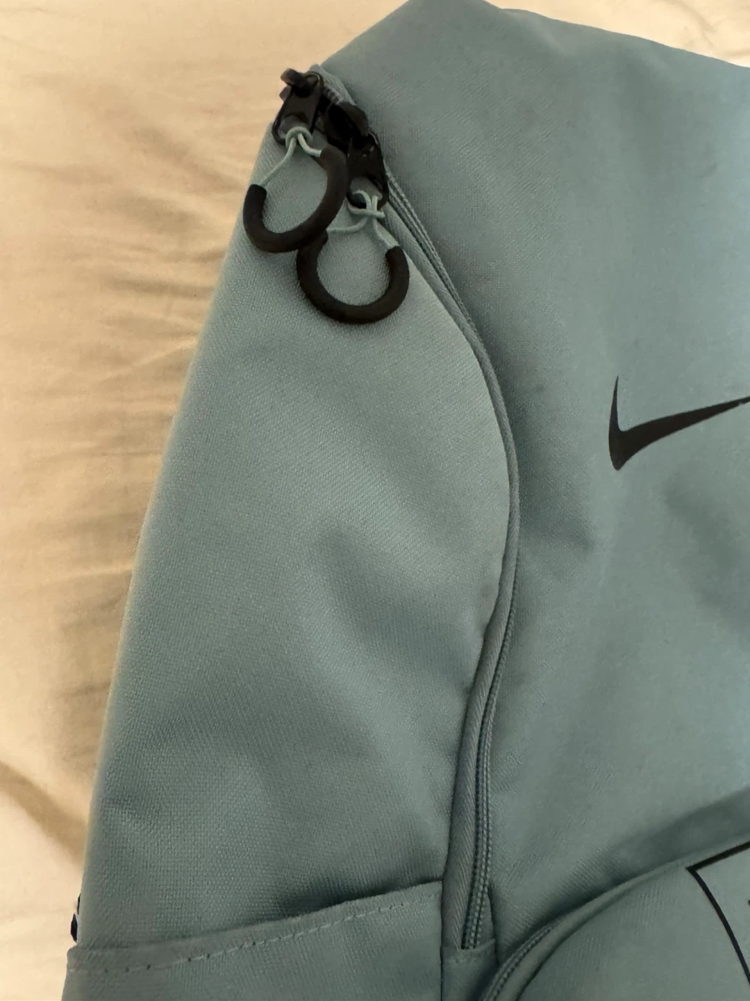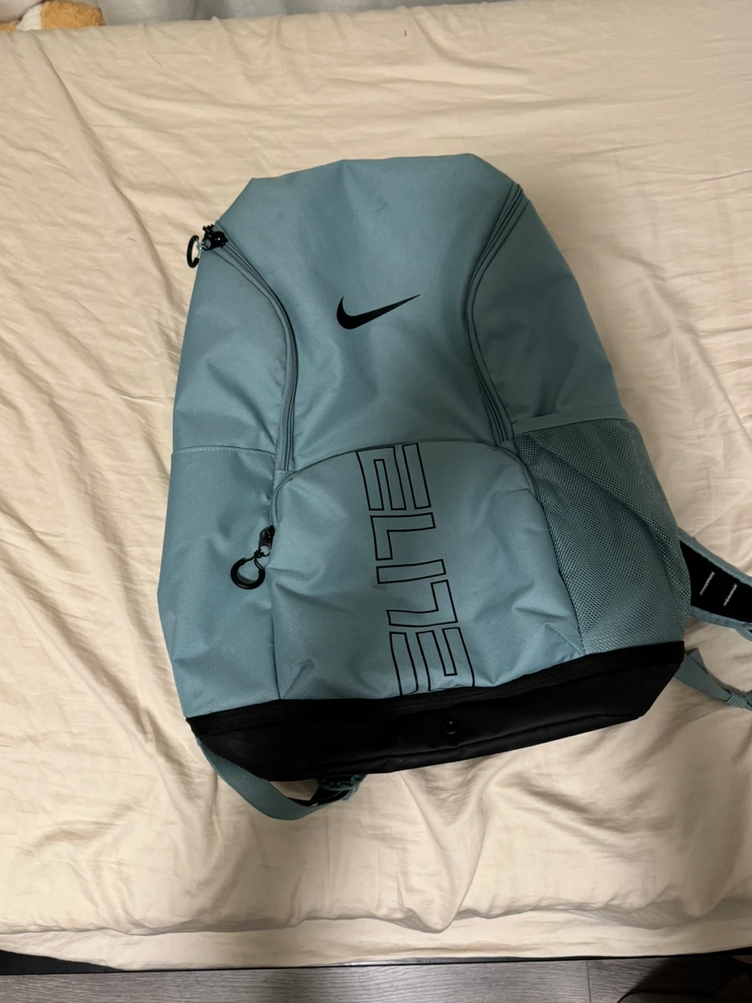 Light blue Nike Elite backpack. It's made of durable material with padded shoulder straps for comfort. Features multiple pockets and a mesh side pocket for water bottles. Great for sports or everyday use! Comes with all the zippers.