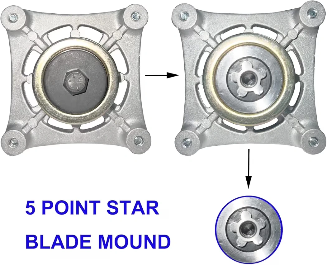 Specs】Overall Height: 7 - 1/2'' (190mm); Mounting Hole Distance: 5 - 5/8'' (143mm); 5-point star-shaped blade mound. It come with four mounting bolts and the spindles were threaded. Package Includes: 2 x Spindle Assembly, 2 x Pulley, 8 x Tapped Bolts, 2 x Blade Nut, 2 x Pulley Nut, 2 x Washer
