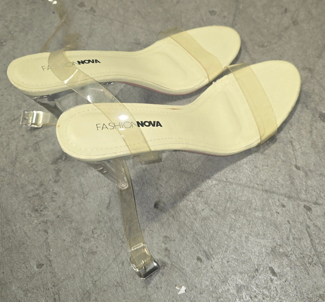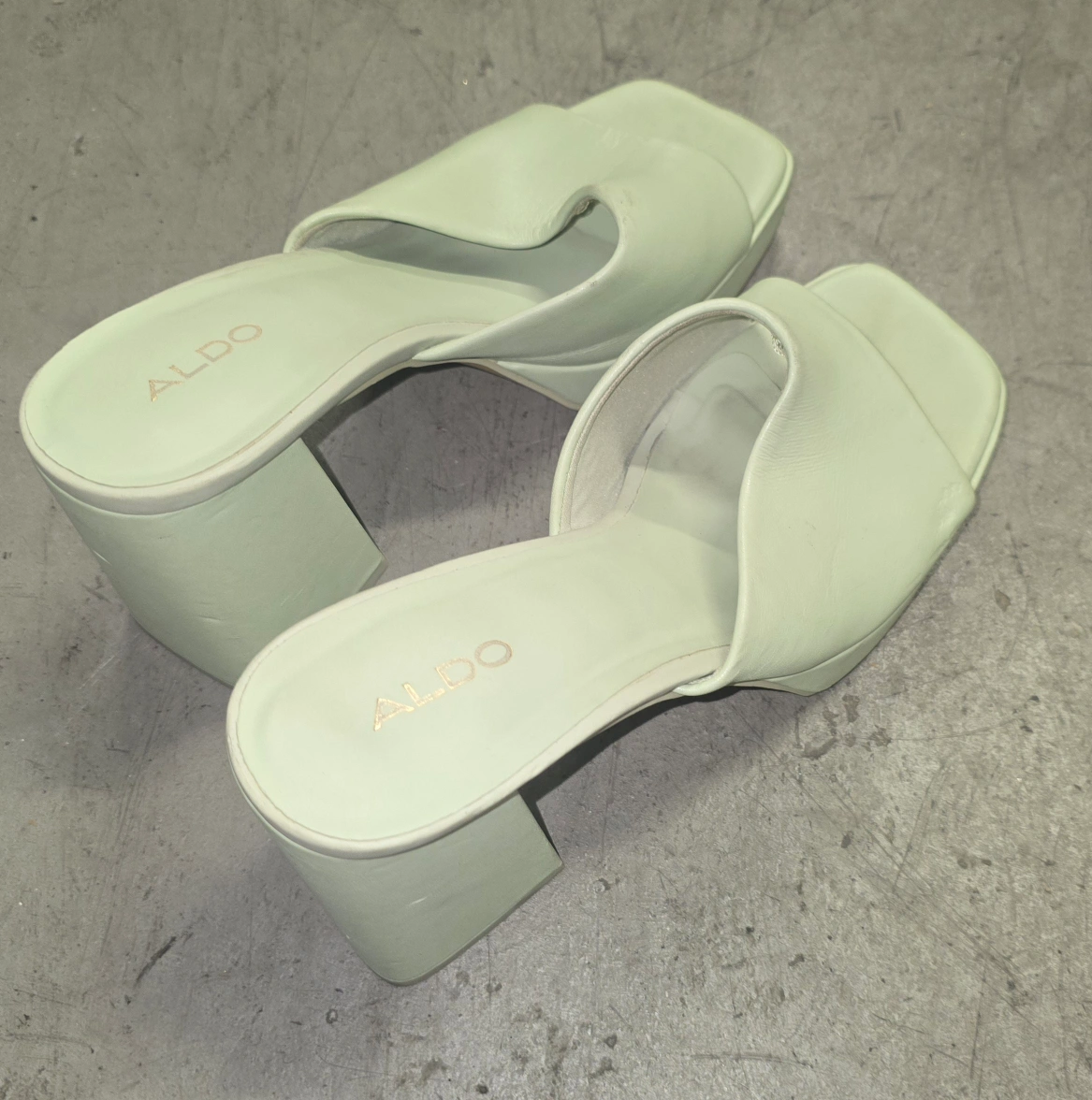 Pair of Fashion Nova clear strap heels. Pair of Aldo pale green platform mules. Both pairs of shoes are women's footwear.