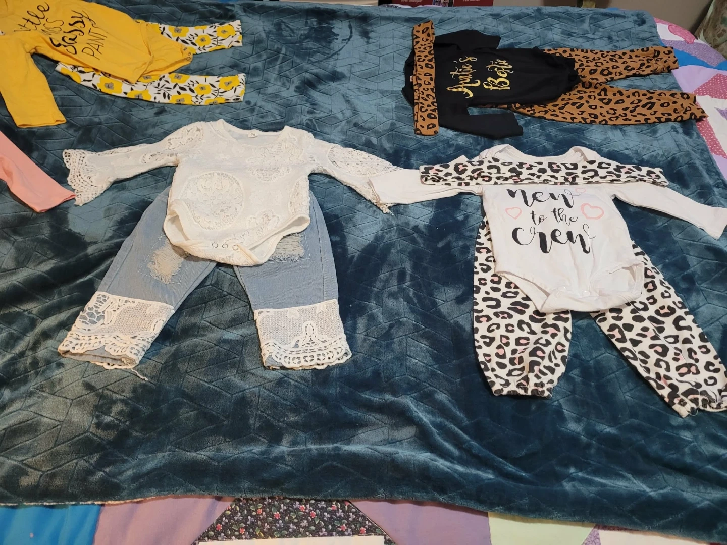 5 new Sets of baby girl outfits. Includes various tops and pants with cute sayings and patterns. One set has a white lace bodysuit with distressed denim pants. Another features a black long-sleeve bodysuit with leopard print accents and matching pants. Yellow and pink options also available. Great for everyday wear or special occasions!