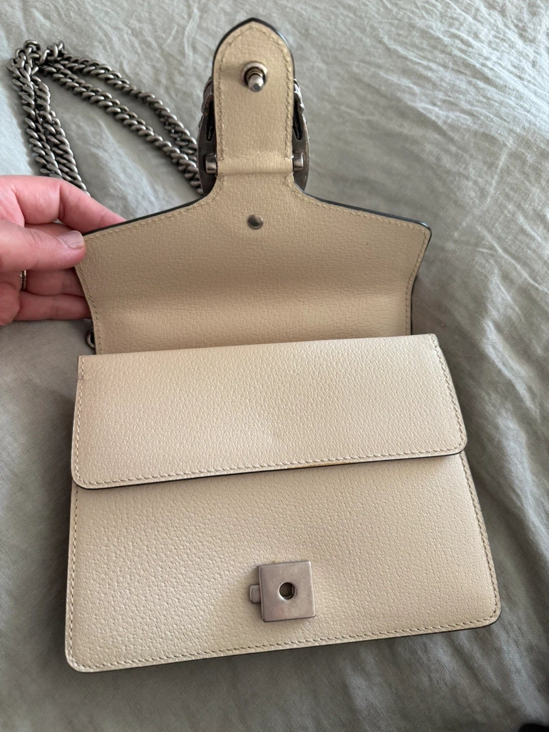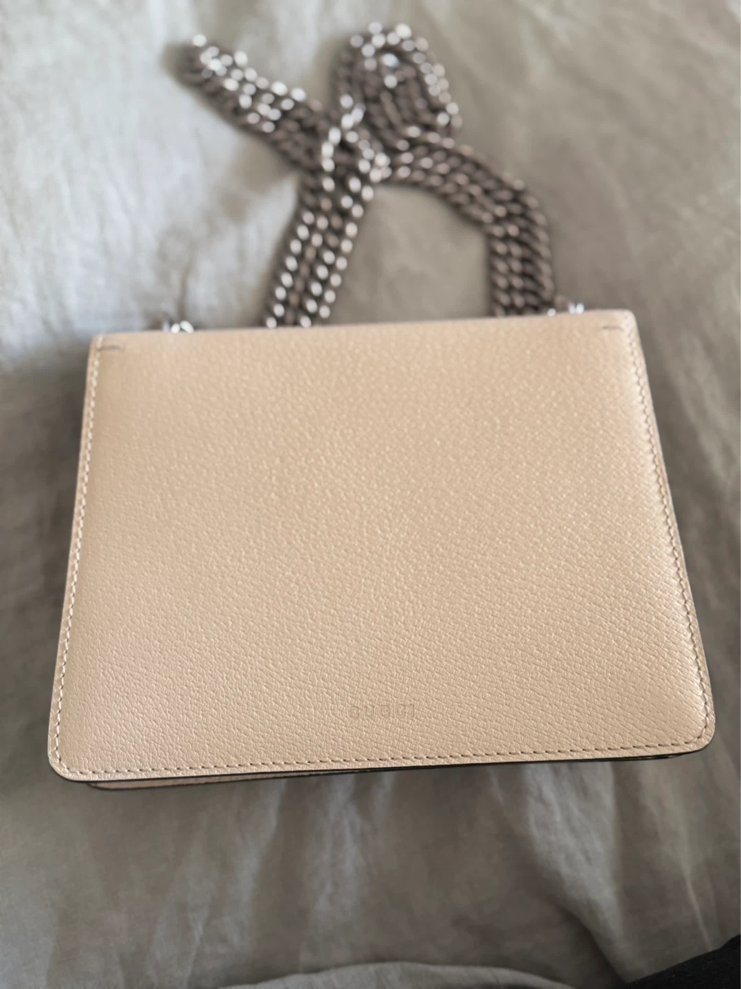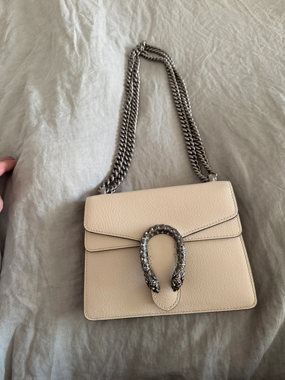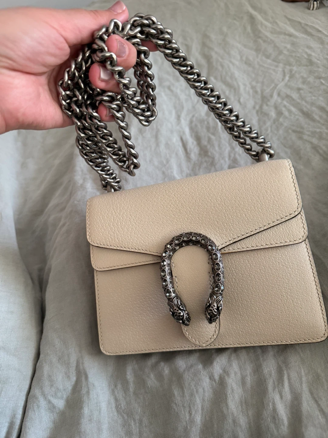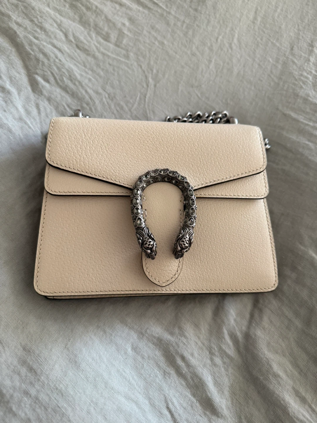 This is a Gucci Dionysus Super Mini bag. It's made of beige textured leather. Comes with a silver-tone chain strap and the signature Dionysus tiger head closure.