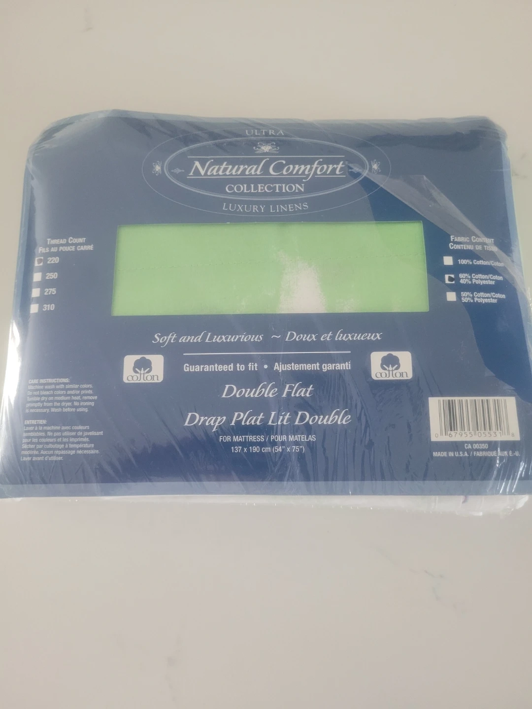 This is a Natural Comfort Collection Double Flat Sheet. It's made with 60% Cotton and 40% Polyester. It's guaranteed to fit a mattress and is soft and luxurious. 137 x 190 cm (54" x 75").