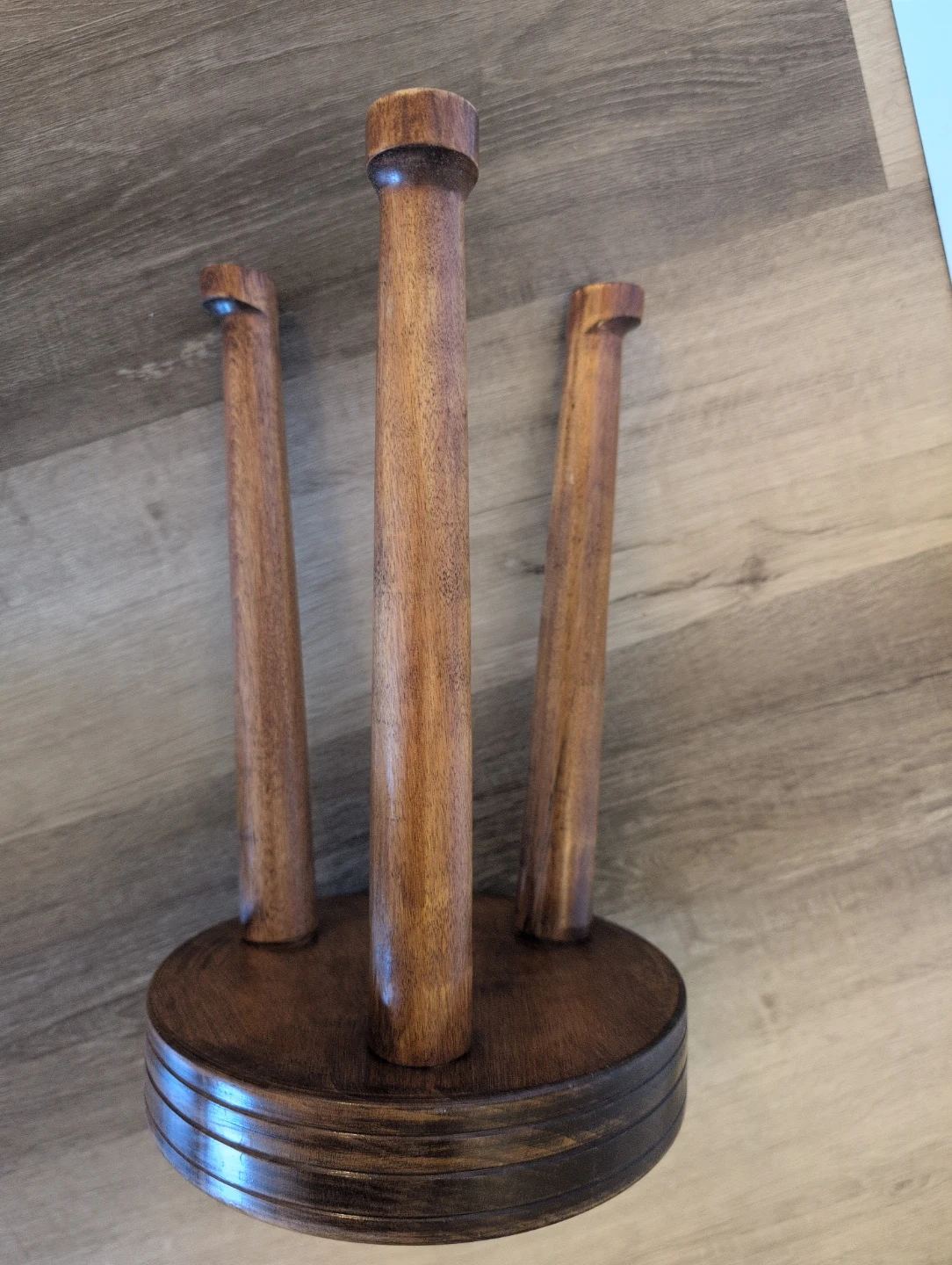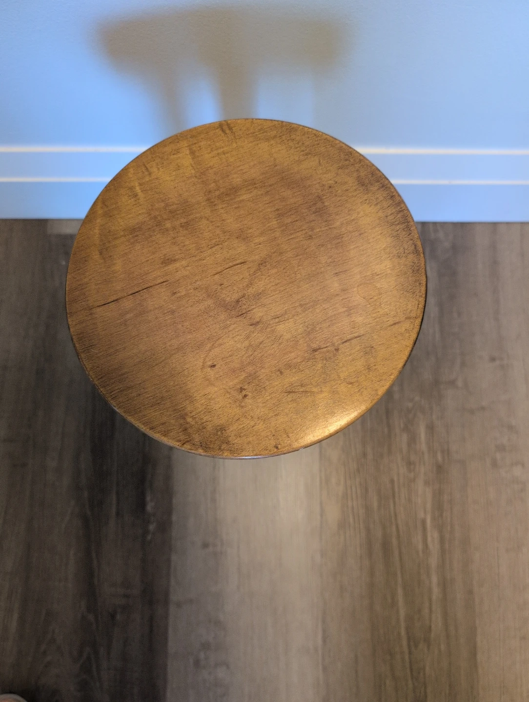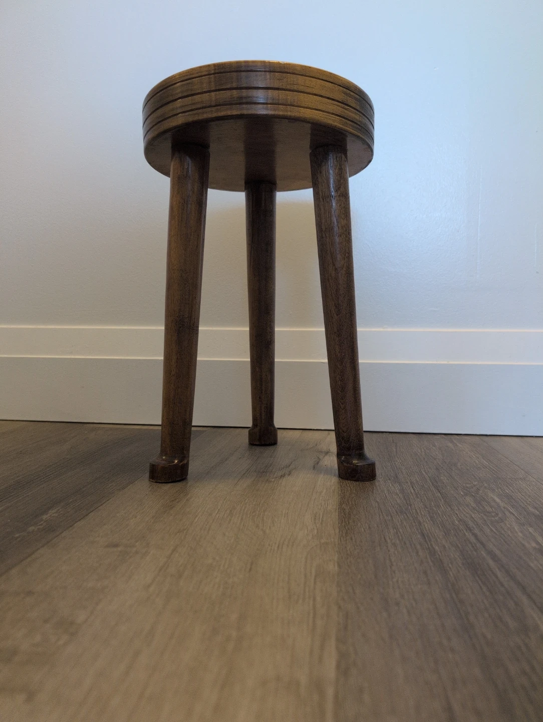 Antique early 1900s wooden milking stool with a round seat and three legs. It's made of solid wood and has a natural varnished finish. It's a versatile piece that can be used as a plant stand or a small footstool.