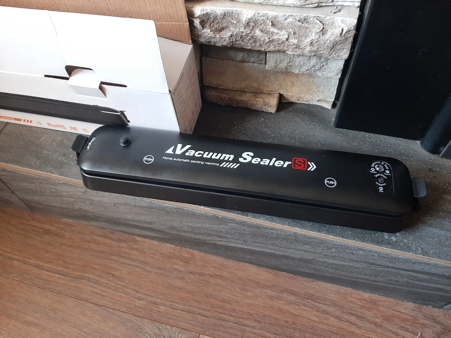 Black vacuum sealer. Home automatic packing machine. Features vacuum and seal functions.