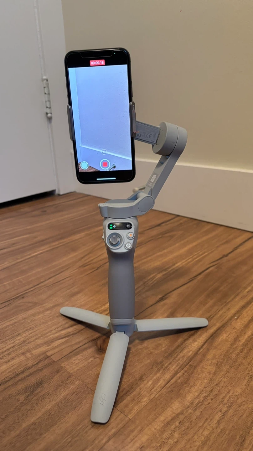 This is a DJI OSMO Mobile 6 smartphone gimbal, great for stabilizing your phone for video recording. It's lightweight and portable. Includes original pouch and charging cable.