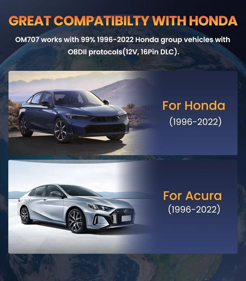 OBDMATE 2025 brand new OM707 car scanner is compatible with Honda / Acura vehicles 1996-2023 with OBDII protocols (12V, 16Pin DLC). This professional code reader performs deep diagnostics for the all Honda's vehicle systems (ABS/SRS/Engine/ Transmission) beyond full basic OBD2 functions. It supports reading and erasing fault code, displaying graphic live data and reading VIN information.