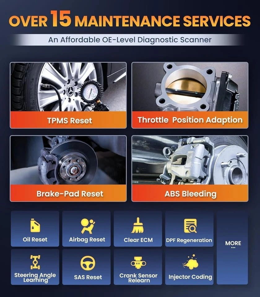 OM707 code reader features most commonly used reset functions to take care your daily maintenance, saving hundreds in dealership fees. The functions include OIL Reset, Throttle Reset, EPB Reset, SAS Airbag Reset, Battery Register, ABS Bleeding, Injector Coding, TPMS Reset, Transmission Self-learning, Clear PCM Adaptive Value, Suspension Calibration, Steering Angle Calibration, Damper Stroke Calibration, DPF Regeneration, etc. Note: Feature availability may vary depending on your vehicle's year, make, and model.