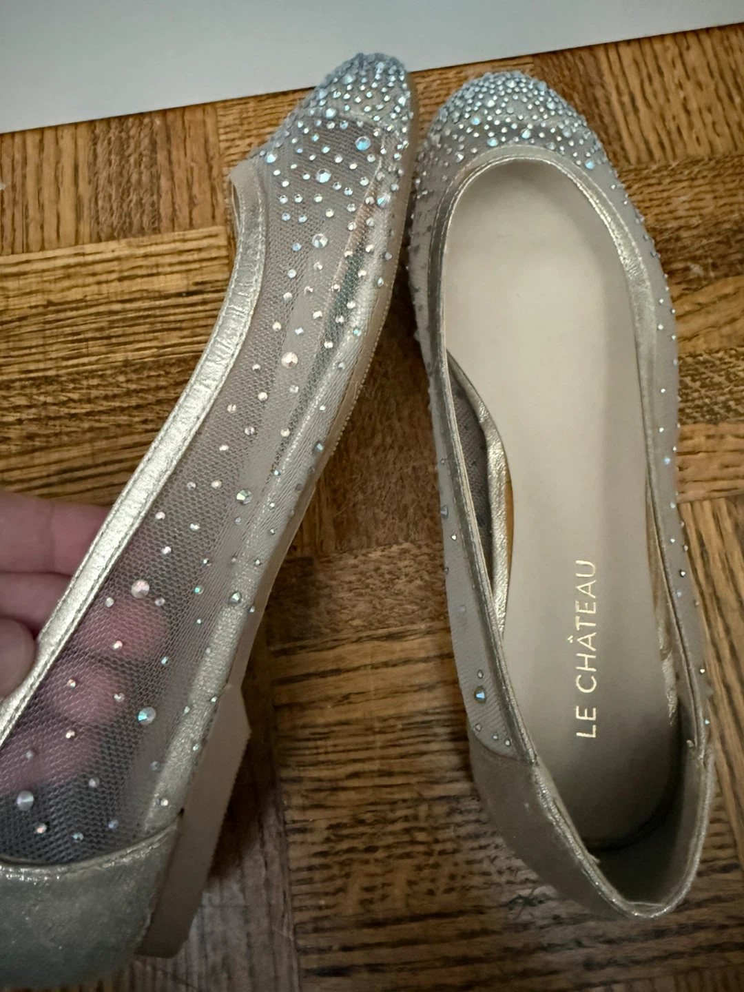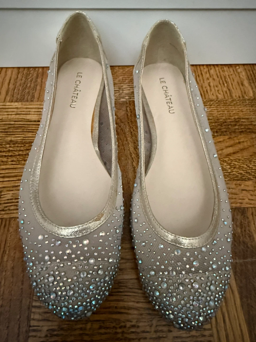 Sparkly Le Château ballet flats. These shoes are covered in rhinestones and feature a delicate mesh overlay. They have a gold-toned trim around the opening.