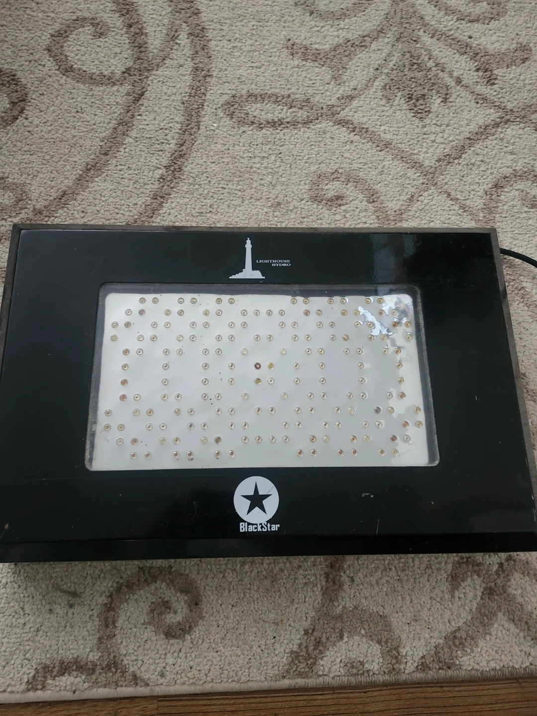 This Lighthouse Hydro BlackStar grow light is a rectangular LED panel. It's designed for horticultural use. The unit has a black frame with a white light array.