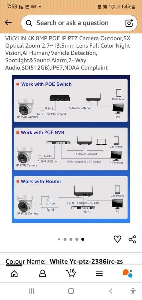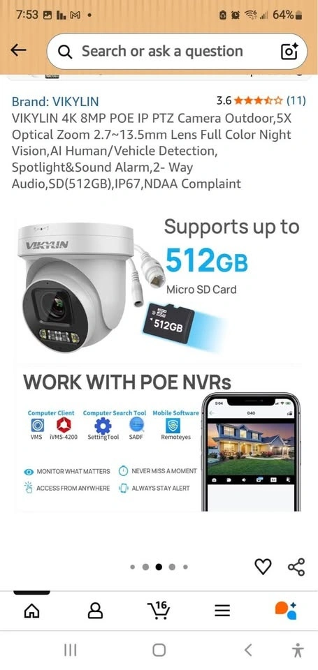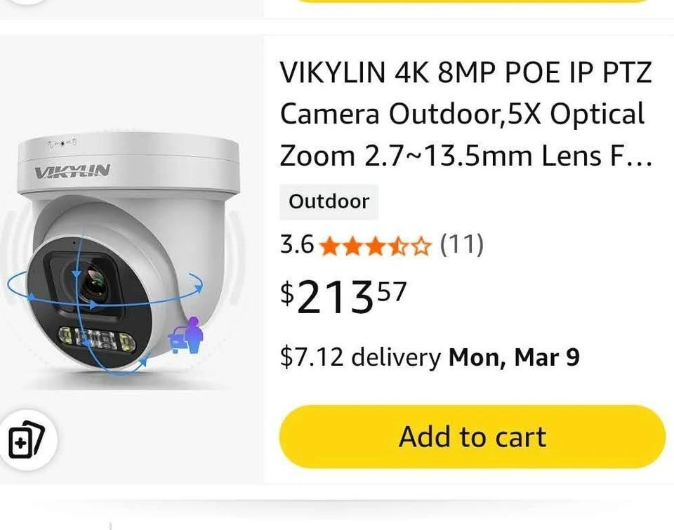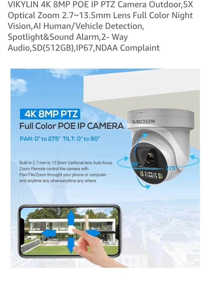VIKYLIN 4K 8MP POE IP PTZ Camera for outdoor use, featuring a 5X optical zoom with a 2.7~13.5mm lens, full colour night vision, AI human/vehicle detection, spotlight and sound alarm, 2-way audio, SD(512GB), NDAA compliant. Key features include: 8MP high-resolution video, 5X optical zoom, full colour night vision, AI-powered detection, two-way audio. Feel free to message if you have any questions!