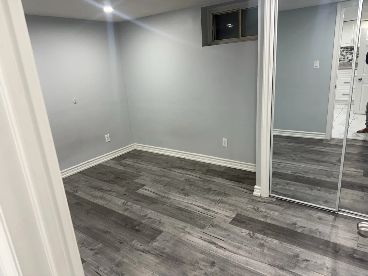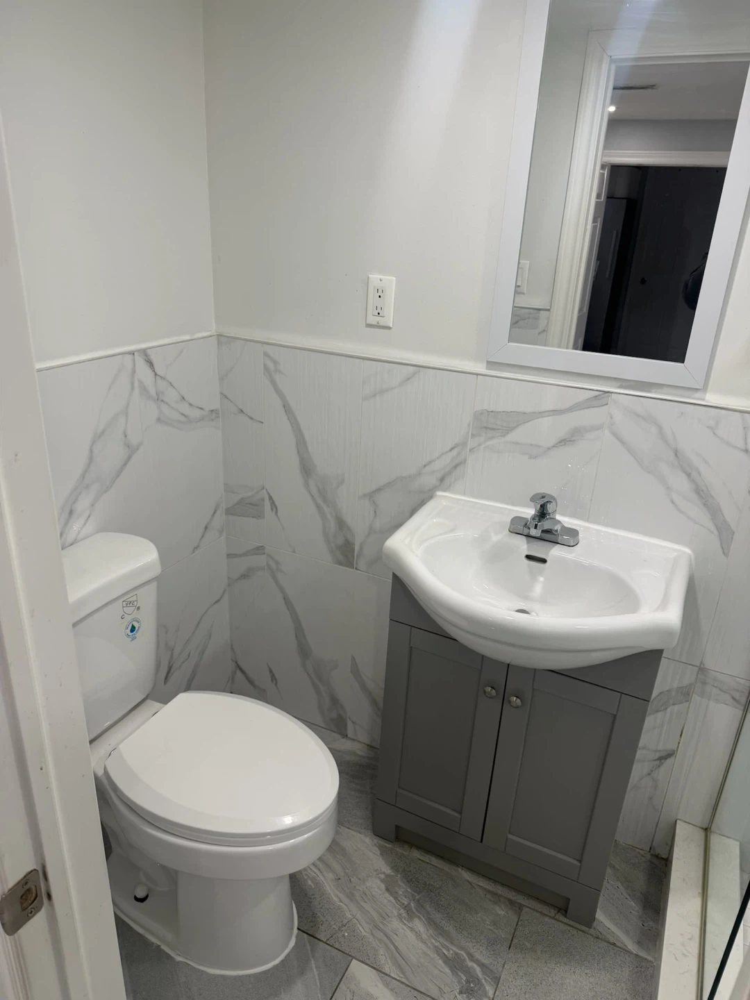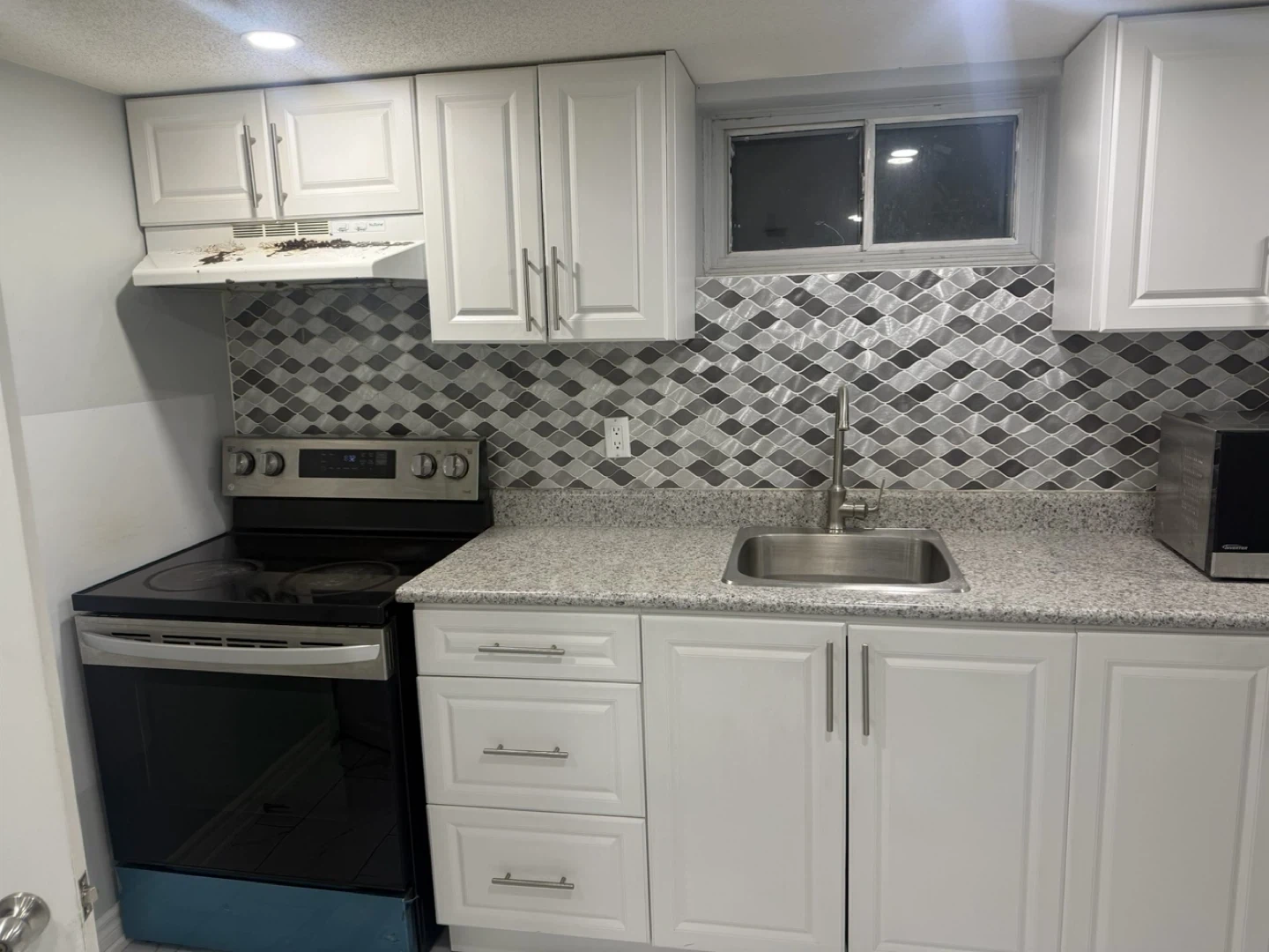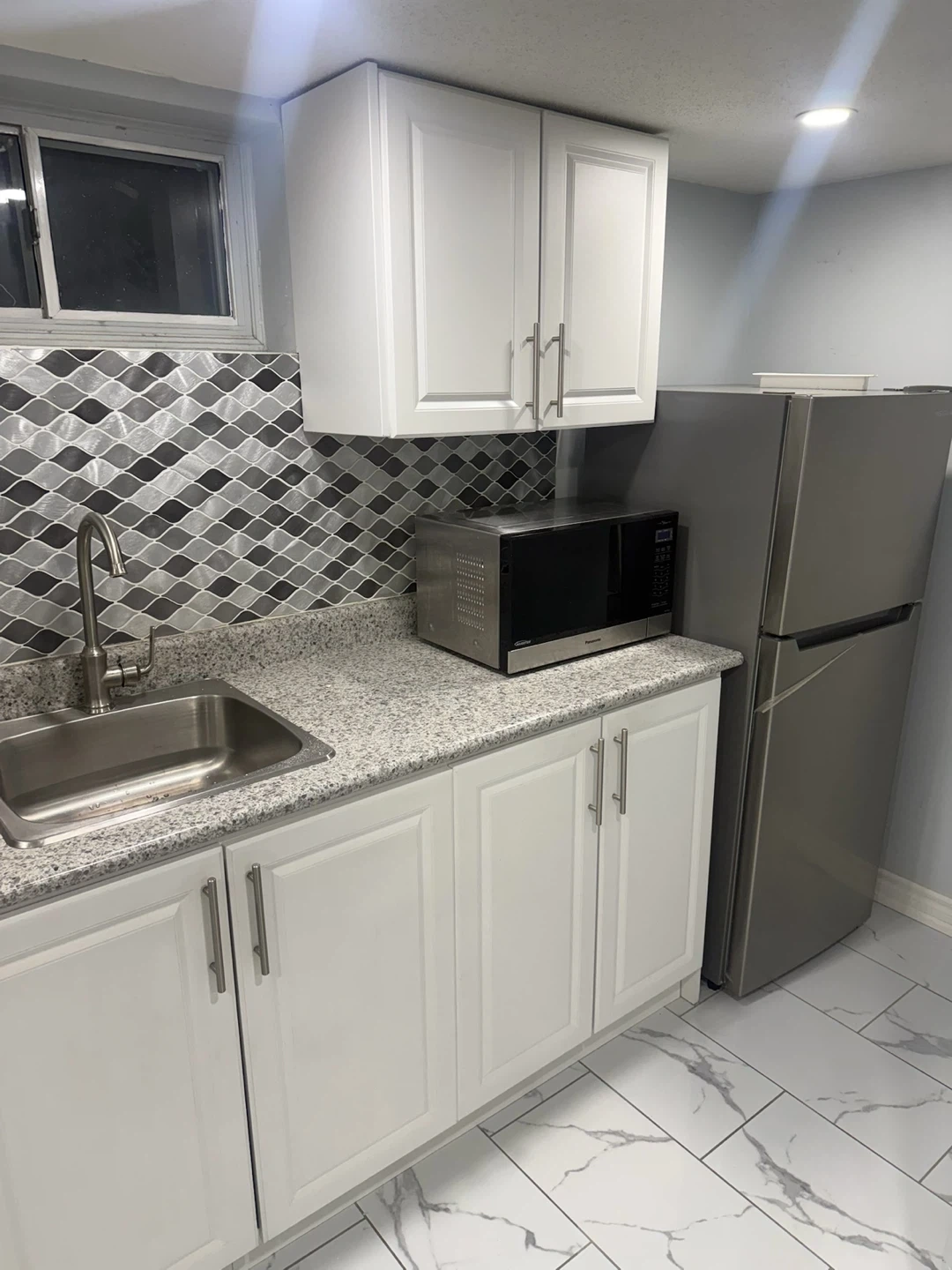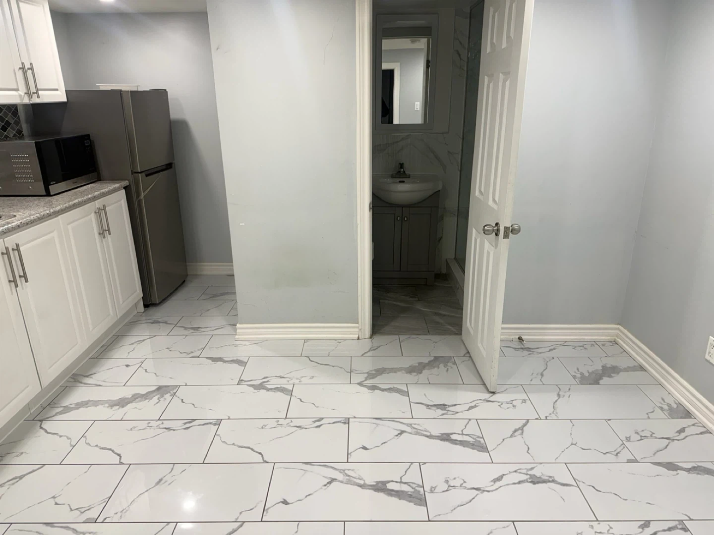 Compact kitchen area with stainless steel fridge, microwave, stovetop, and sink. Adjacent bathroom features a toilet, vanity with sink, and a glass-enclosed shower stall. Ideal for a small apartment or guest suite! We’re looking for a couple or student no parking at all