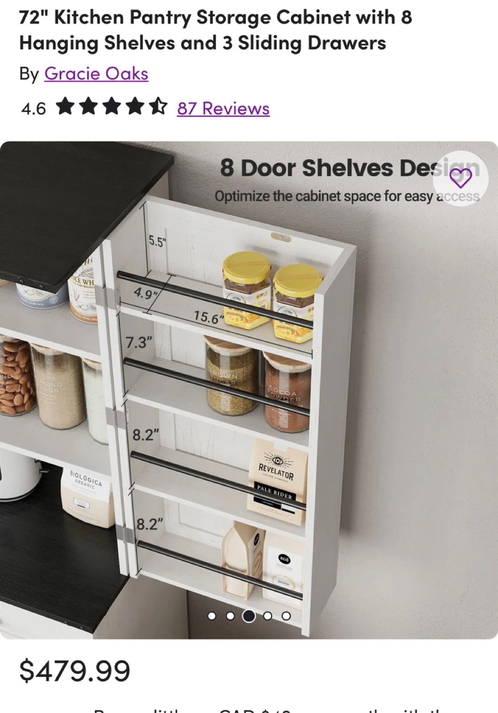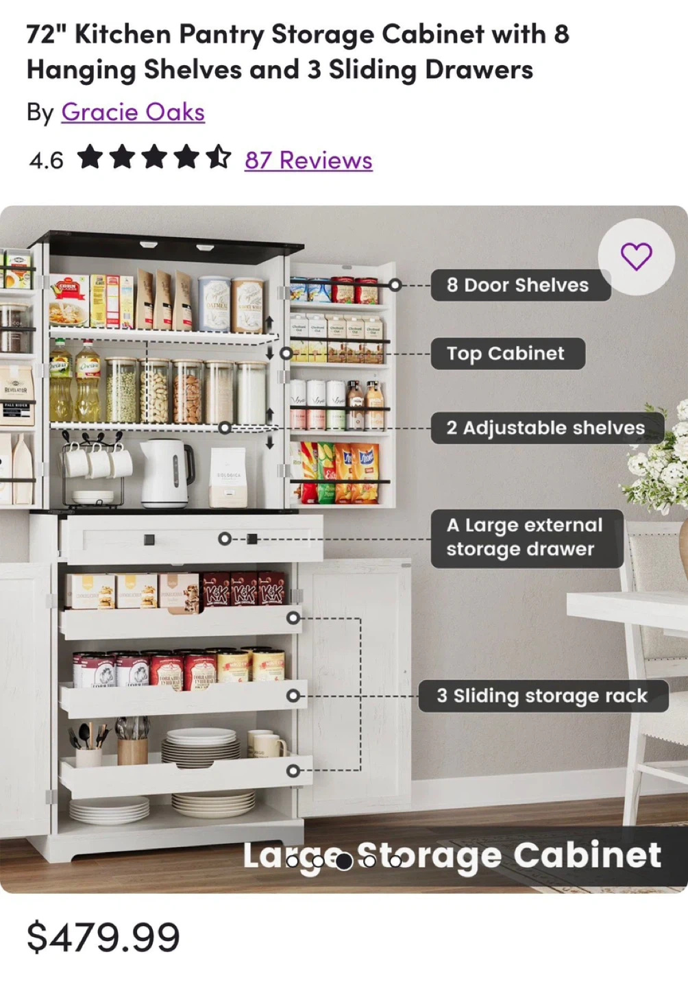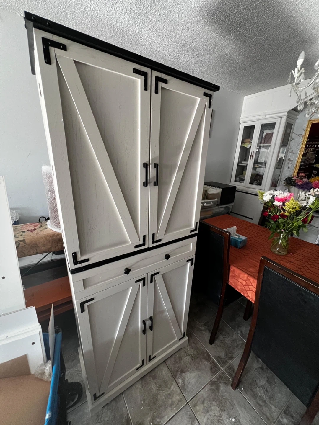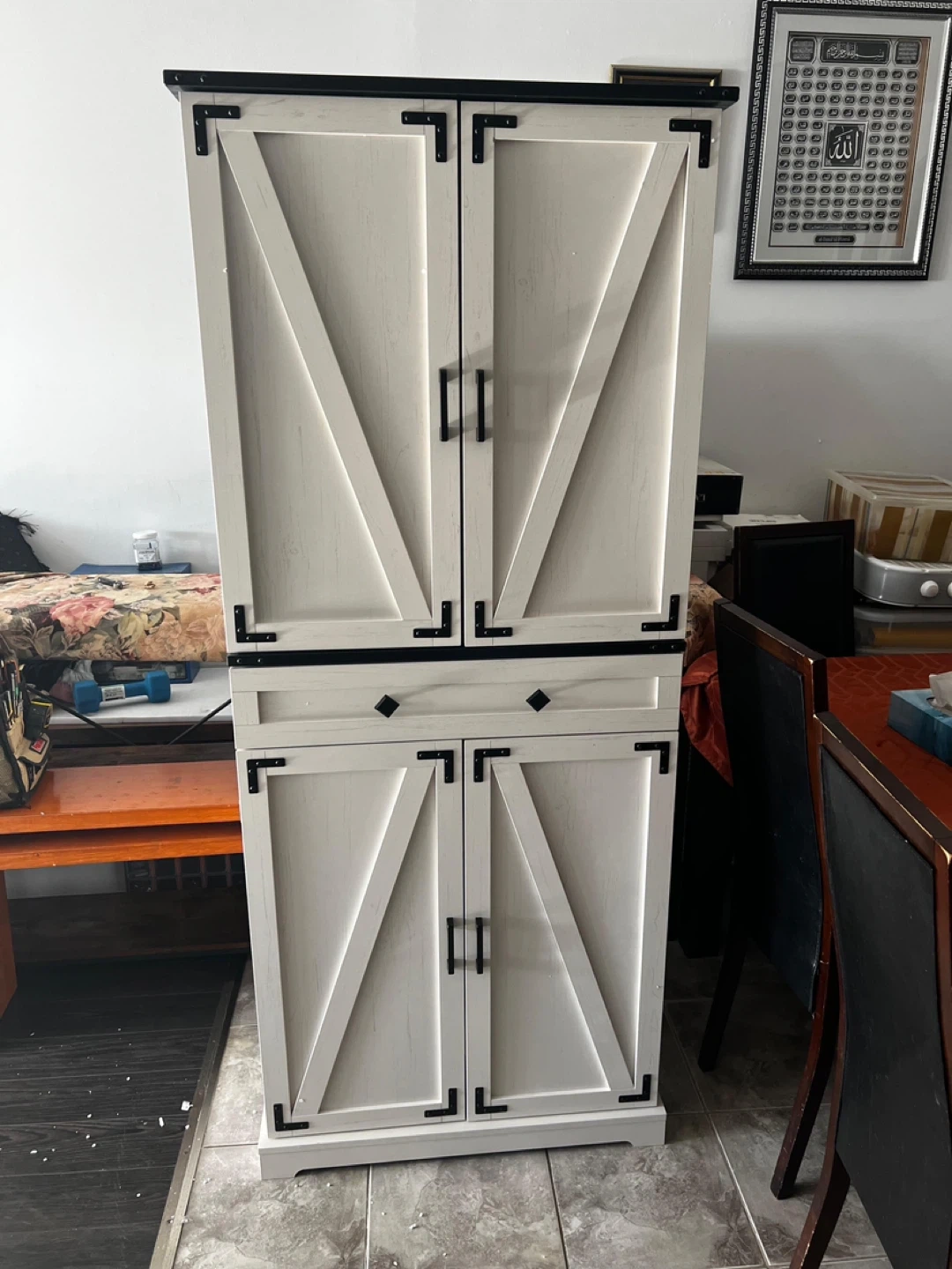 This is a white 72" kitchen pantry storage cabinet. It features 8 door shelves, 2 adjustable shelves, and 3 sliding drawers. The cabinet has a chic metal decor and magnetic locks. Perfect for organizing your kitchen! It’s brand new