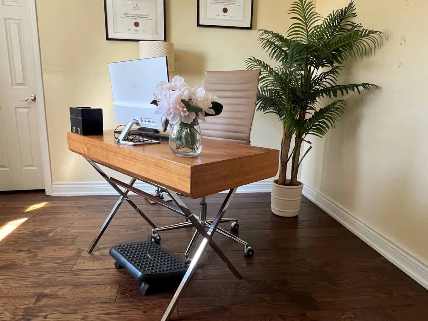 Stylish wooden desk. Two drawers. Chrome legs. Excellent condition. Bought for $550+tax, selling for half price.
