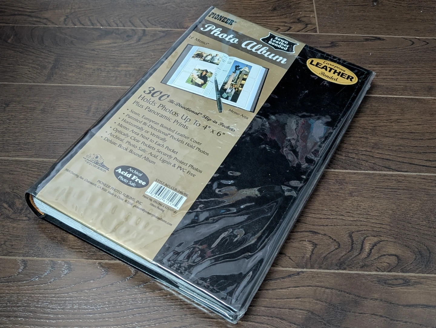 Pioneer black photo album with a European bonded leather cover. It holds up to 300 photos up to 4" x 6" and includes a memo area next to each pocket. The pockets are optically clear, archival, acid, lignin, and PVC free.