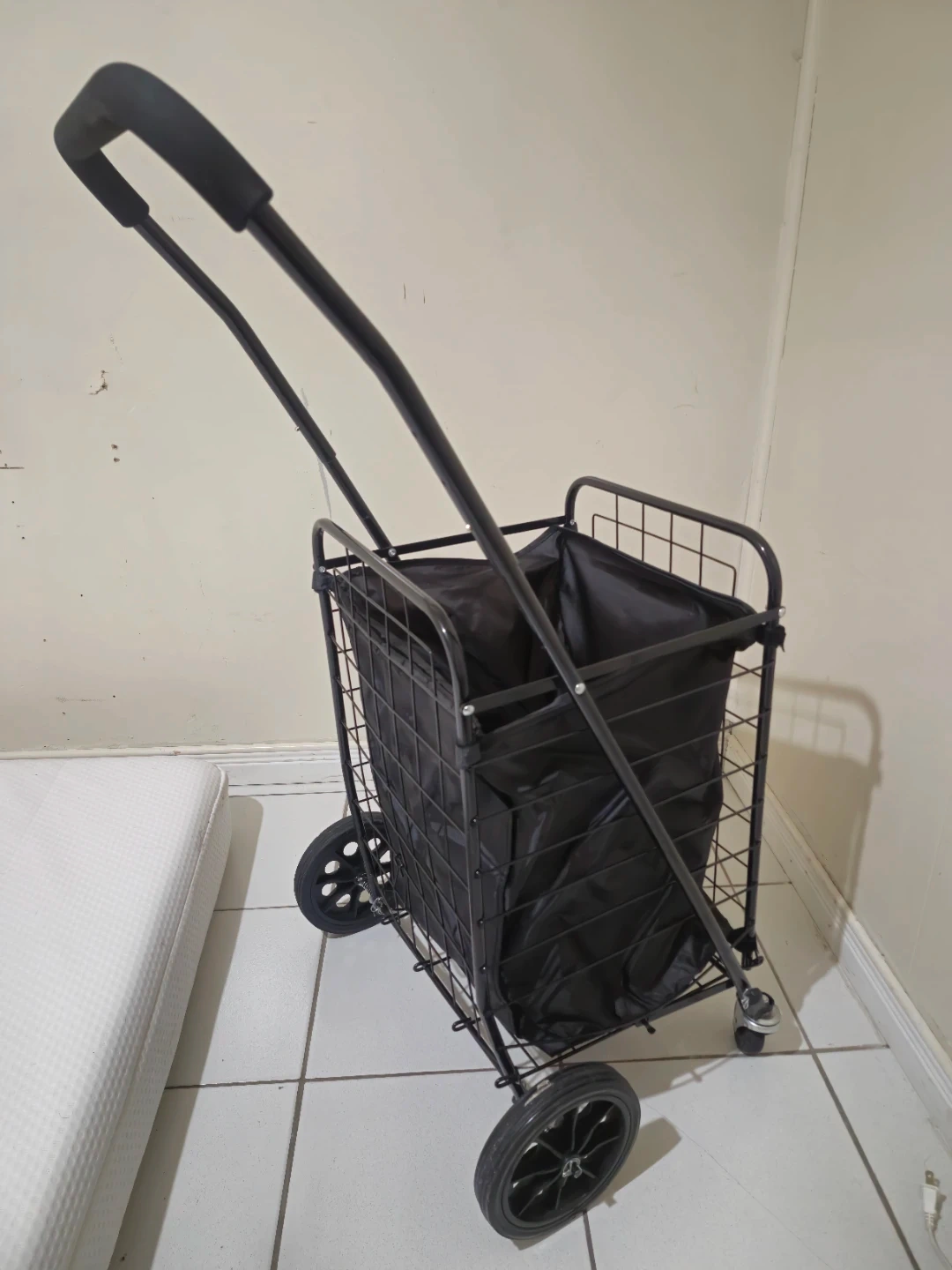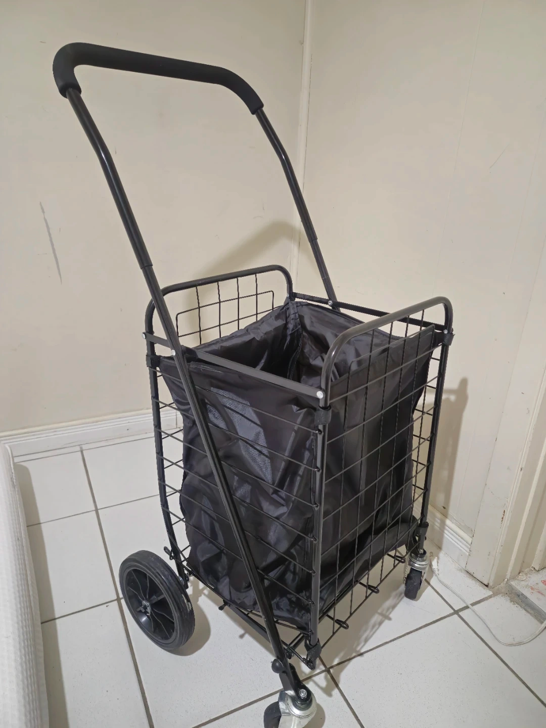 This black rolling shopping cart is perfect for carrying groceries or laundry. It features a sturdy wire frame and a removable fabric liner. Two large wheels make it easy to manoeuvre. It's great for trips to the grocery store or farmers market!