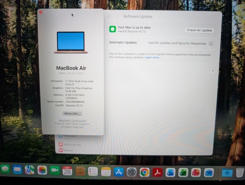 Selling a MacBook Air 13-inch, 2020 model in Rose Gold. It comes with the original box and included components. The laptop features a 1.1 GHz Dual-Core Intel Core i3 processor and Intel Iris Plus Graphics, 8GB of memory and 256GB SSD storage. Runs on macOS Sequoia 15.7.2. Also includes Adobe Pro and Microsoft Office. Feel free to reach out if you're interested!