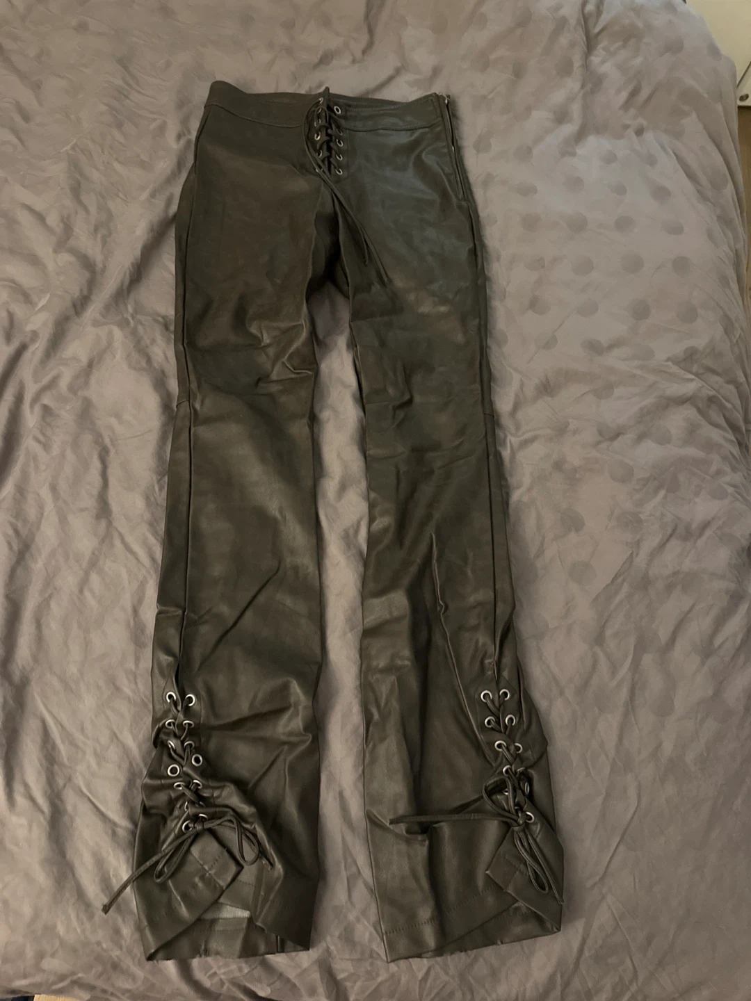 These ZARA pants are made from faux leather and feature a lace-up detail at the front and ankles. They also have a side zipper closure. A fun addition to your wardrobe!