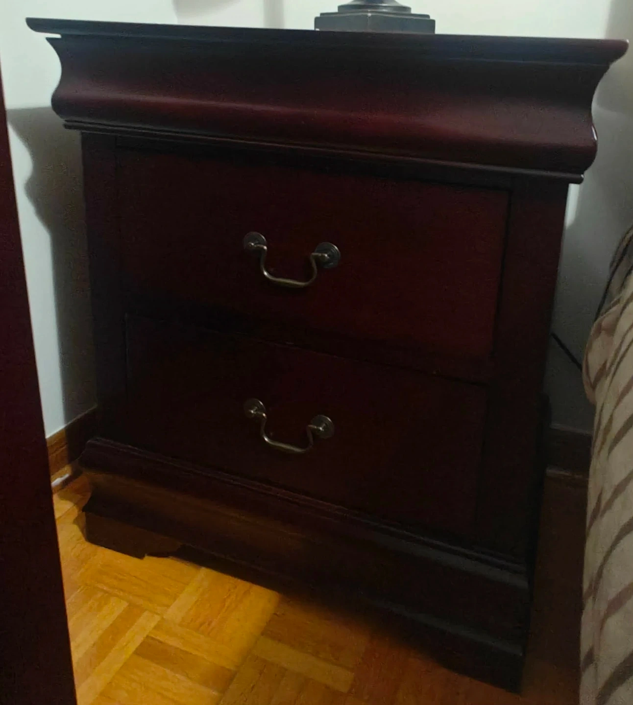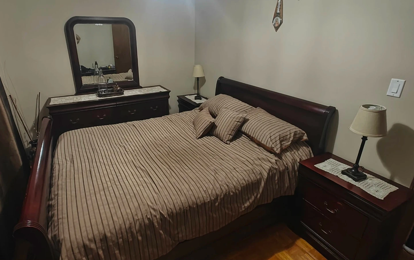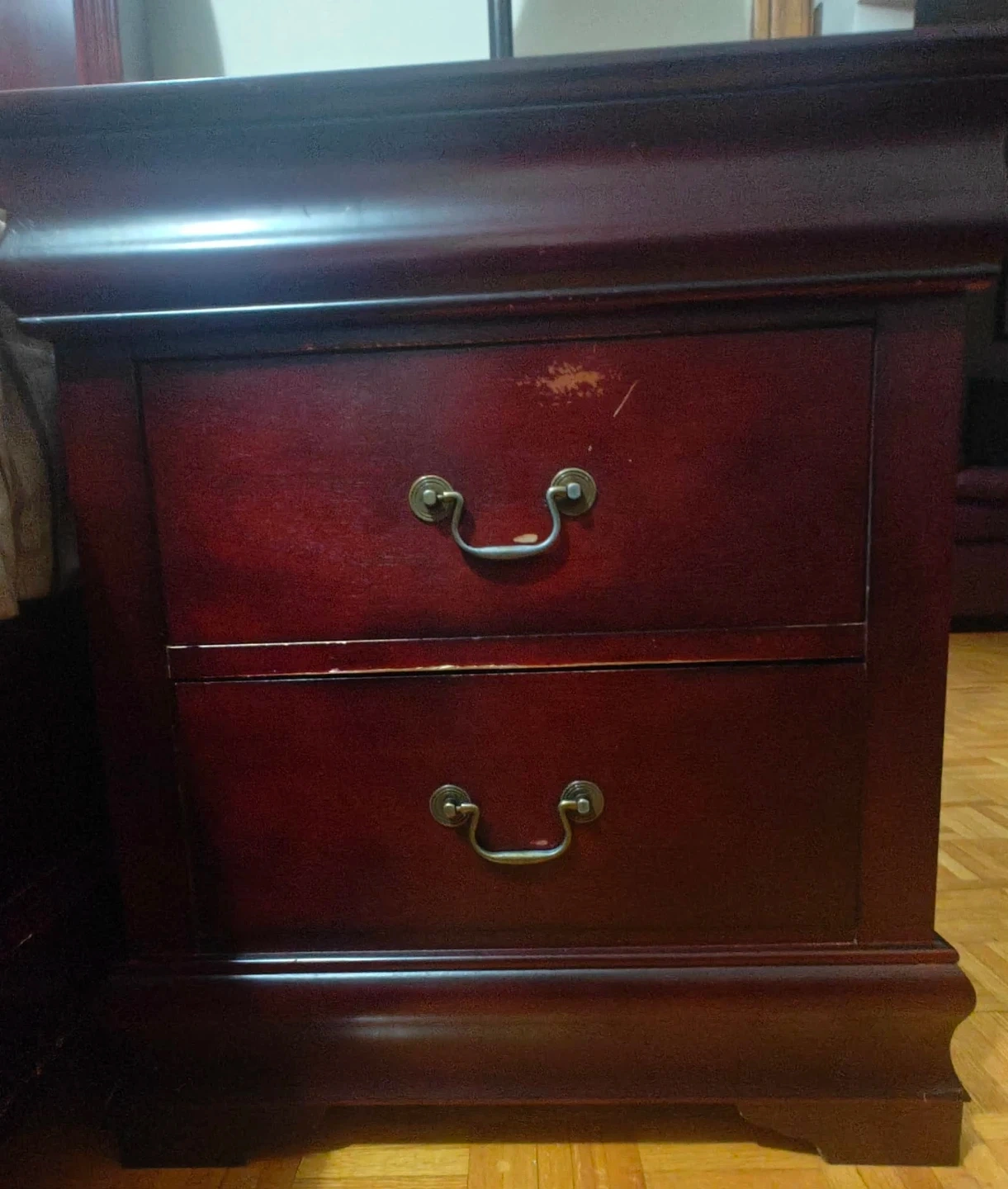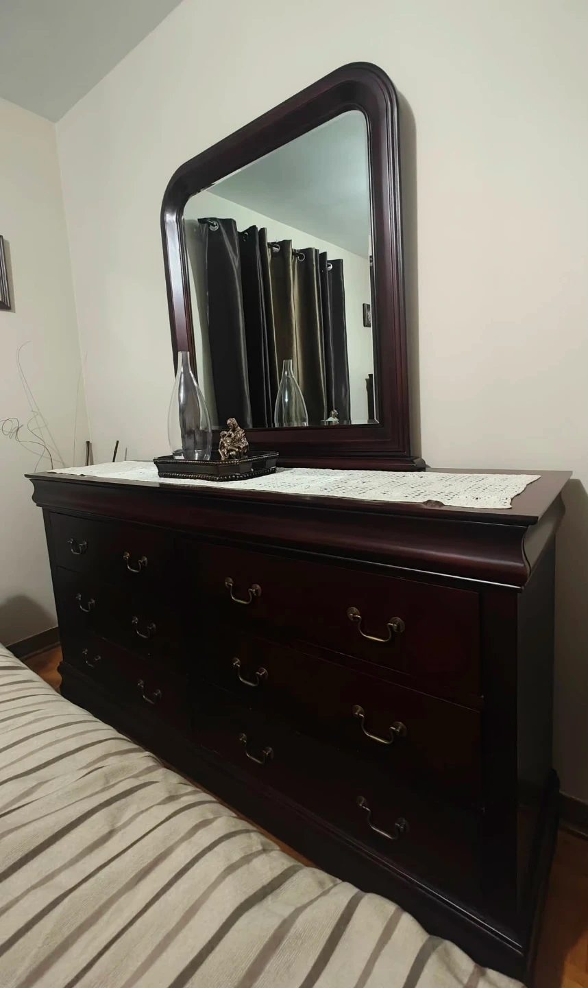 Dark wood bedroom furniture set including a dresser with mirror, two nightstands, and a chest of drawers. The 5th drawer on the chest is functional but difficult to open. Some minor scuffs visible on the top of headboard and one nightstand otherwise fair/good condition.